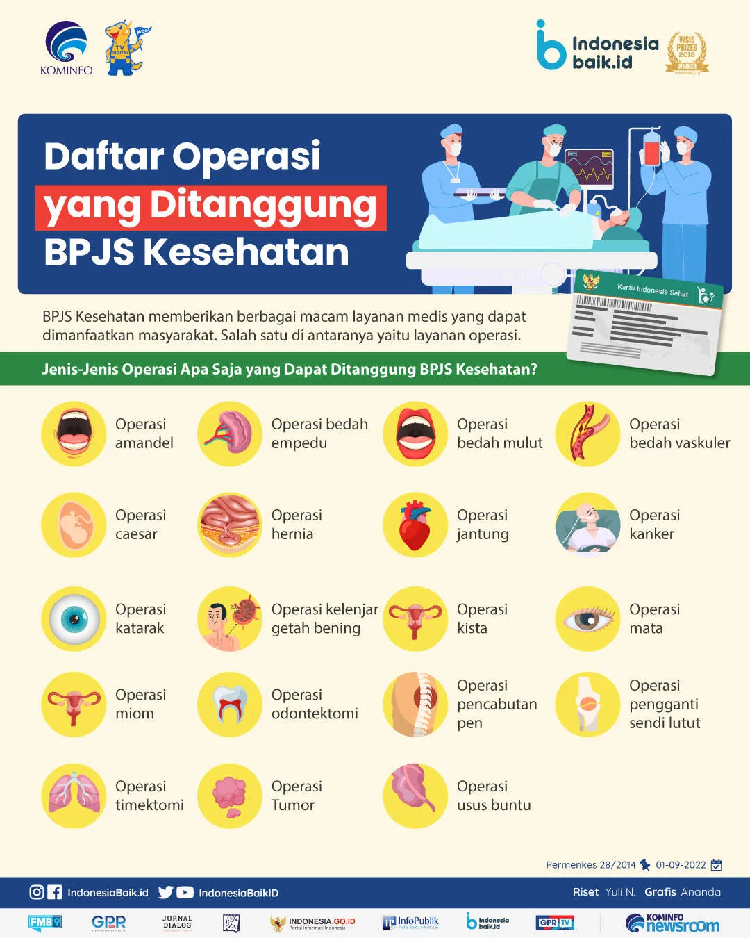 Merujuk Pedoman Pelaksanaan Jaminan Kesehatan Nasional (JKN) dalam Peraturan Menteri Kesehatan (PMK) N0.28 Tahun 2014, dijelaskan bahwa semua biaya operasi dapat dijamin BPJS. Dalam pedoman tersebut dituliskan daftar operasi yang ditanggung oleh BPJS Kesehatan 2022. Berikut daftar yang mendapat jaminan: