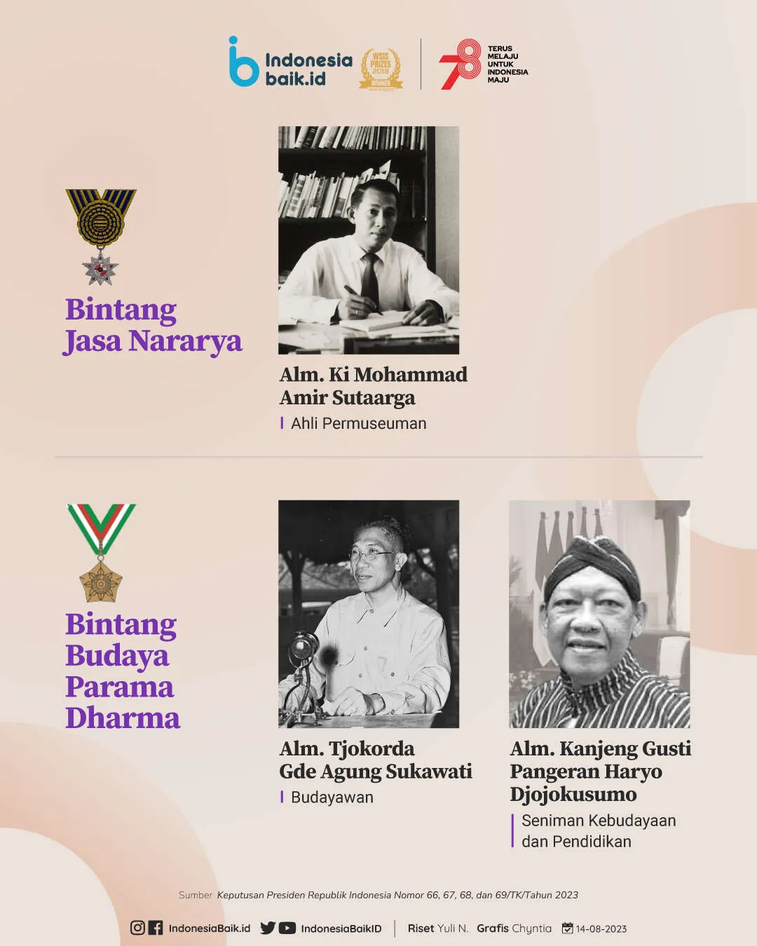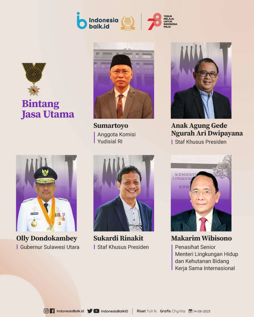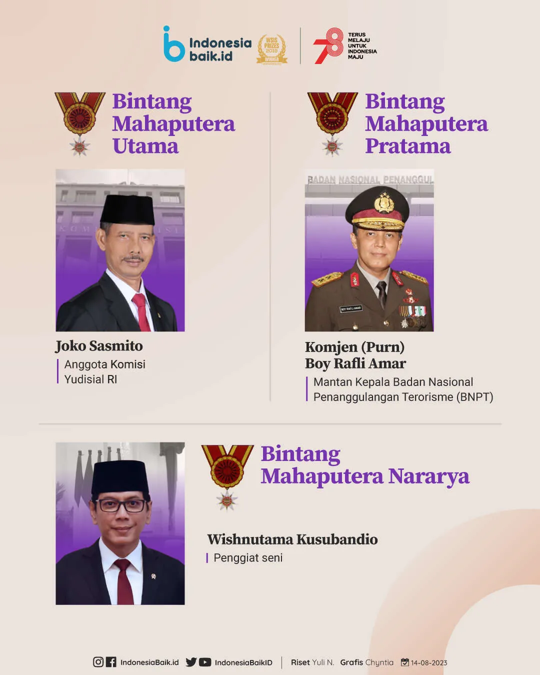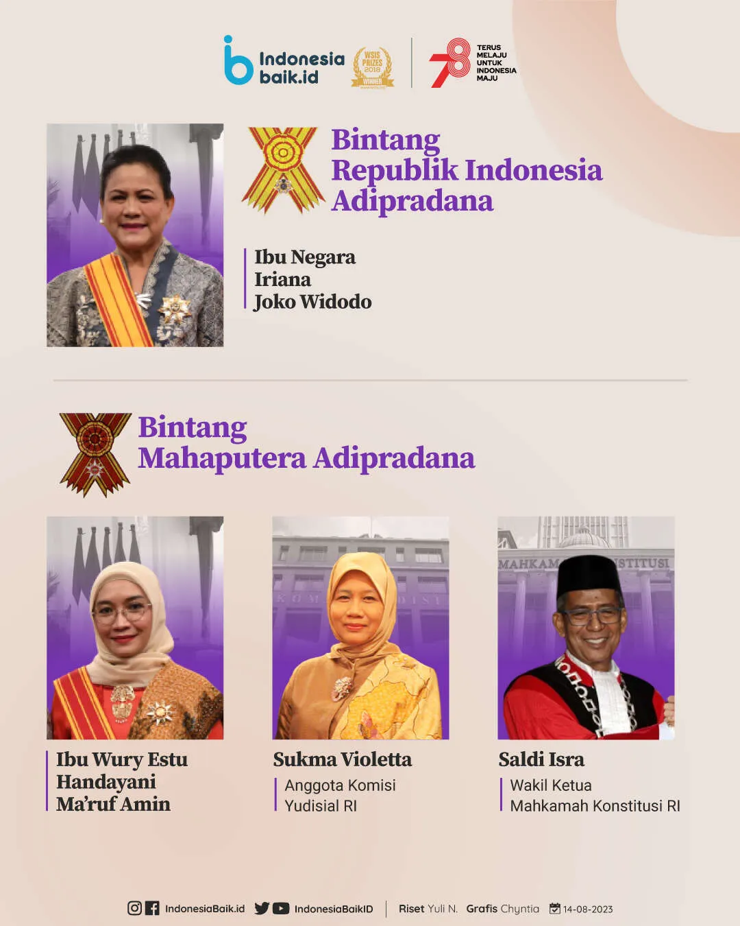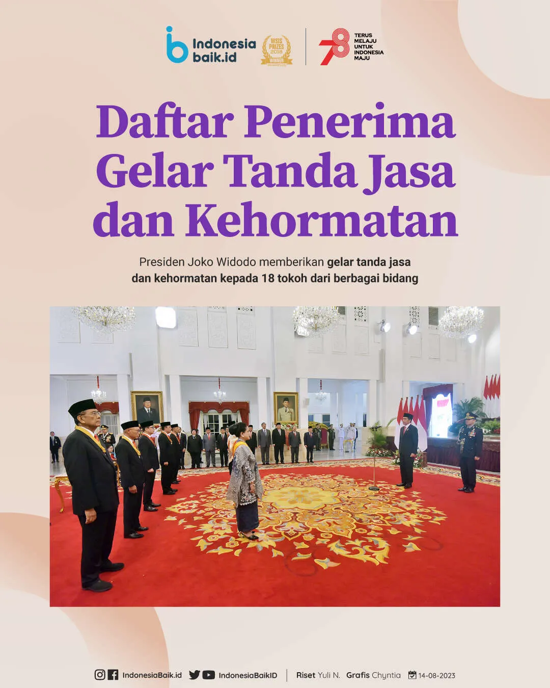 Indonesiabaik.id - Presiden Joko Widodo (Jokowi) menganugerahkan tanda jasa dan kehormatan Republik Indonesia dalam rangka menyambut HUT ke-78 Republik Indonesia.