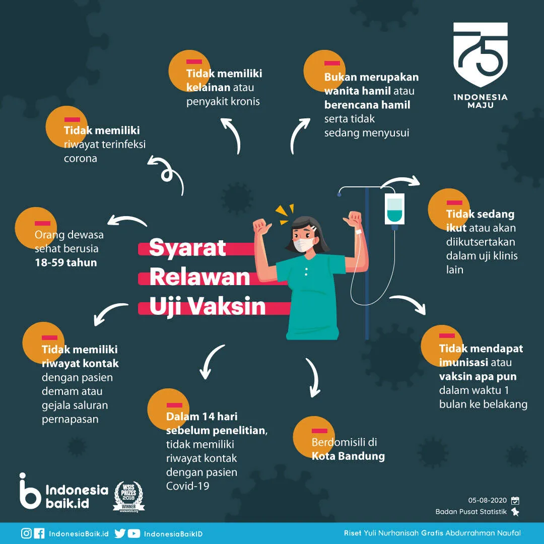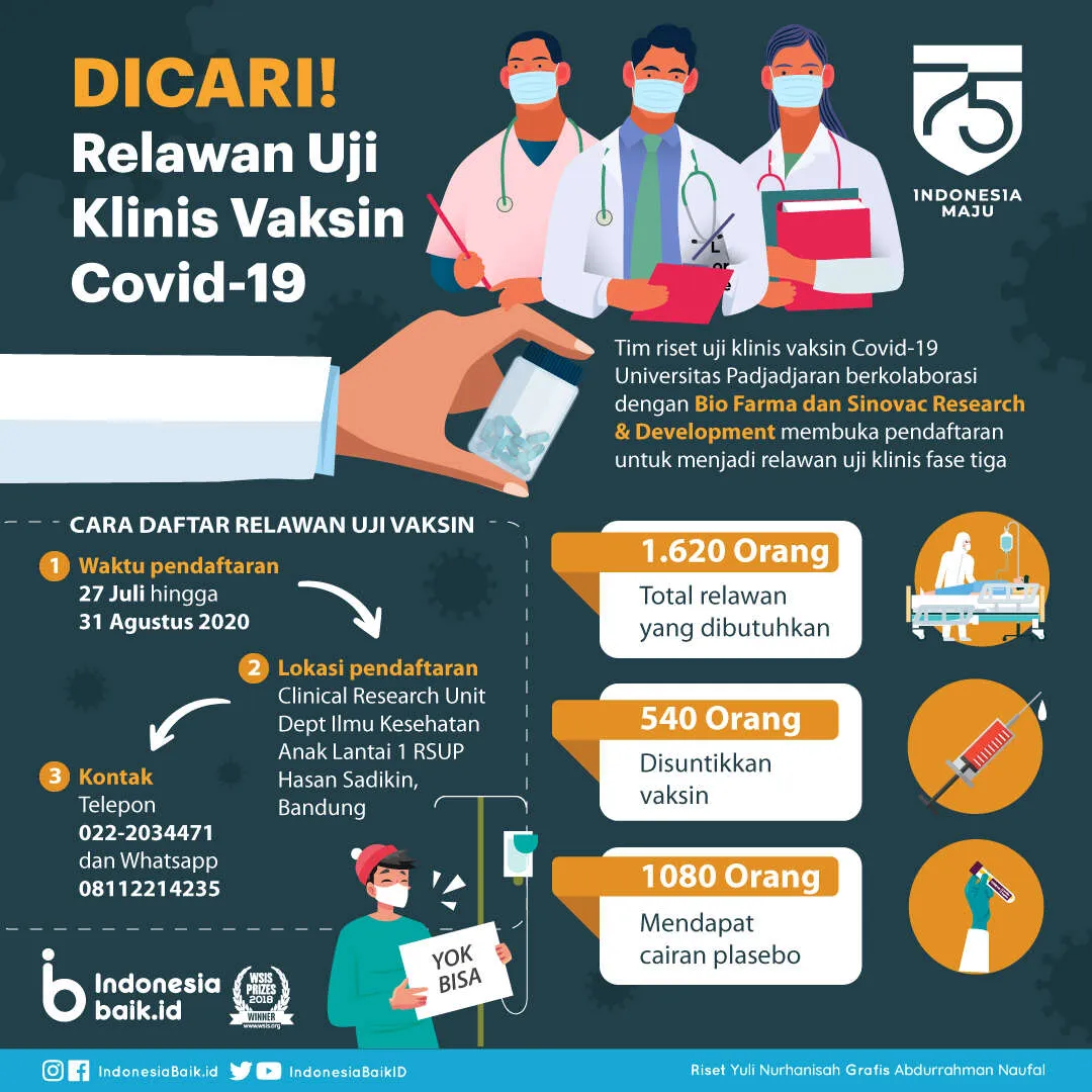 Indonesiabaik.id - Tim riset uji klinis vaksin Covid-19 Universitas Padjadjaran berkolaborasi dengan Bio Farma dan Sinovac Research & Development membuka pendaftaran untuk menjadi relawan uji klinis fase tiga vaksin corona itu. Pendaftaran ini dibuka setelah tim riset Unpad mendapat persetujuan dari komite etik penelitian universitas.