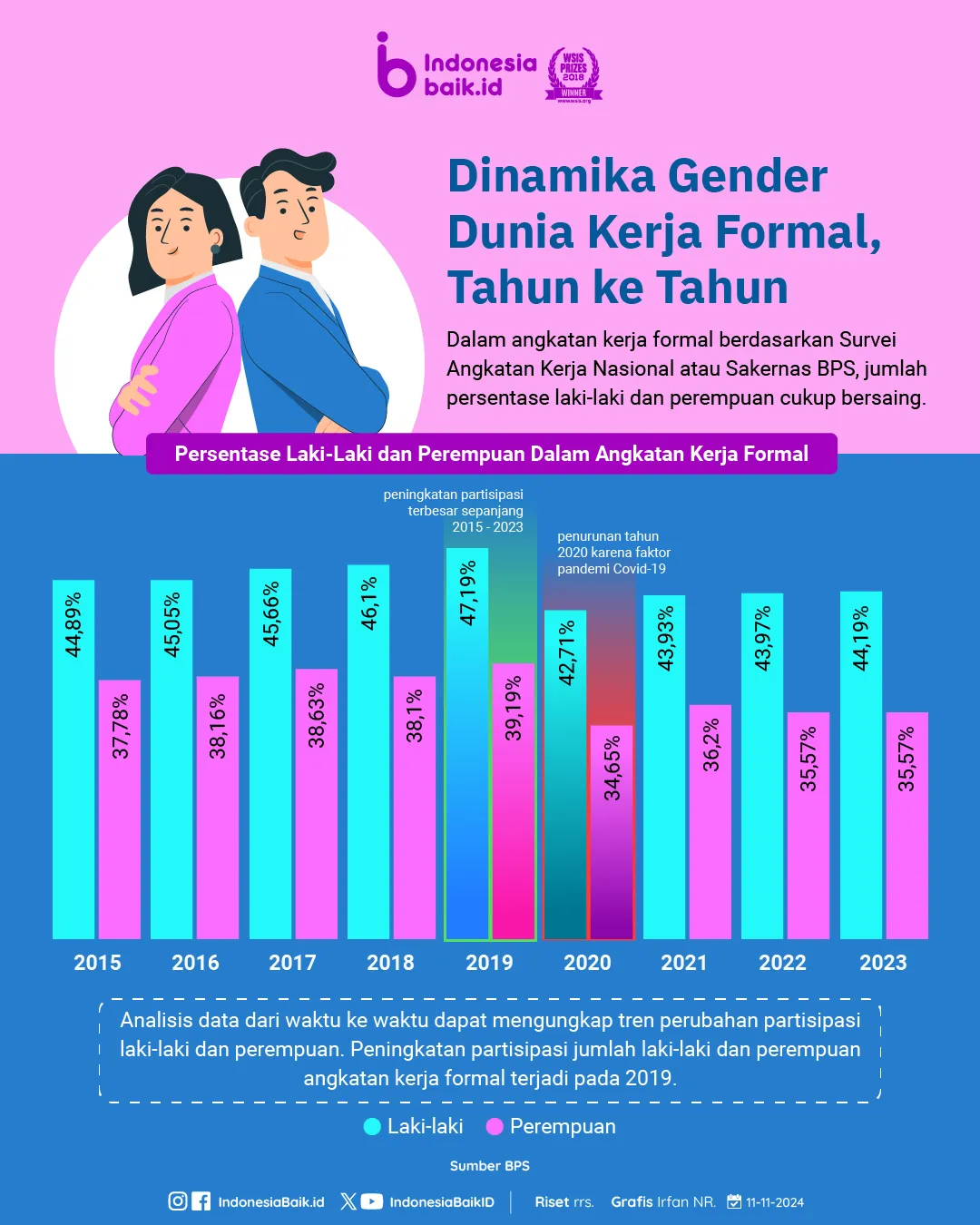 Indonesiabaik.id - Berdasarkan Survei Angkatan Kerja Nasional atau Sakernas BPS, jumlah persentase angkatan kerja formal laki-laki dan perempuan tahun 2015 hingga 2023 cukup bersaing. Untuk persentase laki-laki Tahun 2015 sebanyak 44,89%, tahun 2016 sebanyak 45,05%, 2017 sebanyak 45,66%, 2018 sebanyak 46,1%, 2019 sebanyak 47,19%, 2020 sebanyak 42,71%, 2021 sebanyak 43,93%, 2022 sebanyak 43,97%, dan 2023 sebanyak 44,19%.