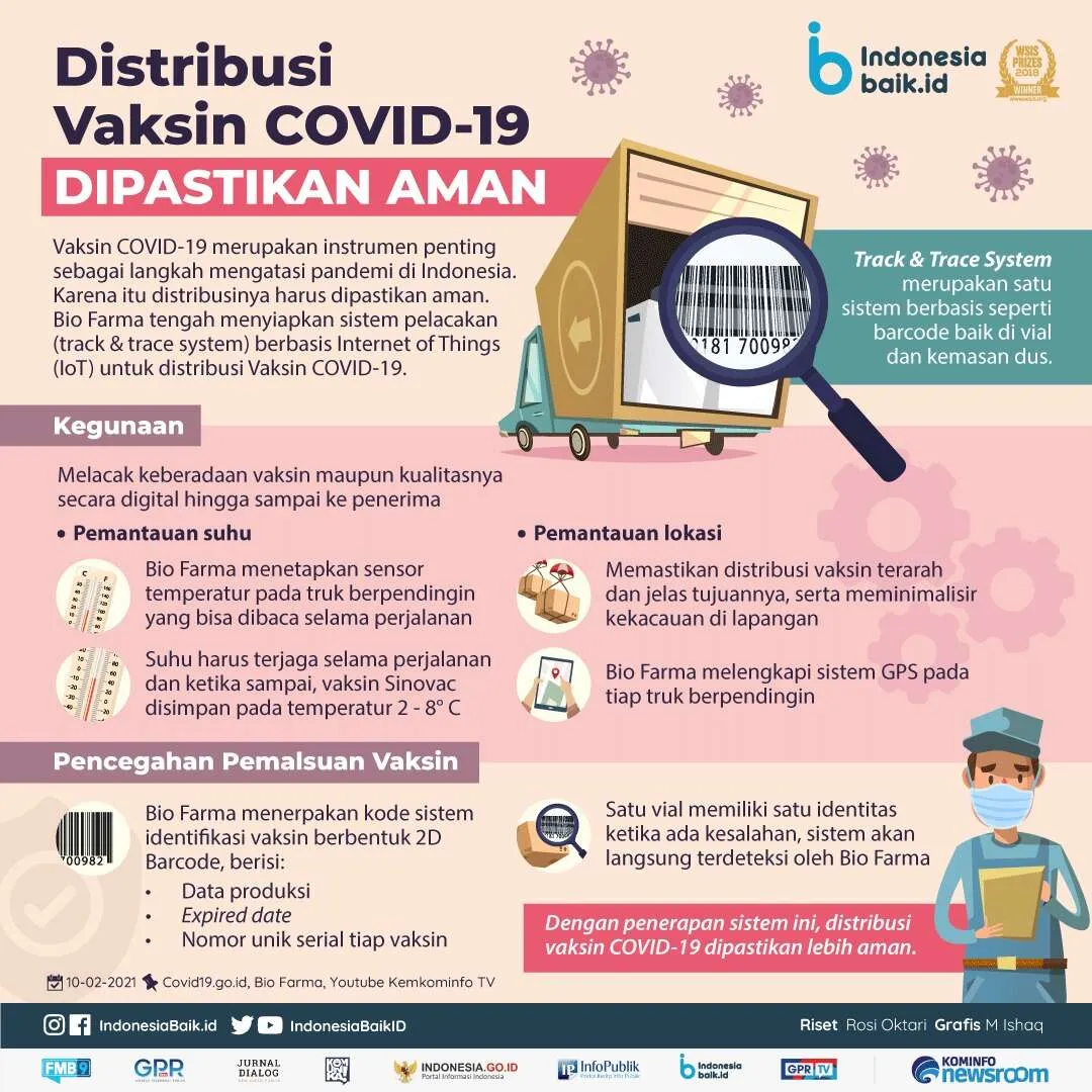 Vaksin COVID-19 merupakan instrumen penting sebagai langkah mengatasi pandemi di Indonesia, karena itu distribusinya harus dipastikan aman. Penggunaan Track & Trace System oleh Bio Farma menjadi salah satu kuncinya, merupakan satu sistem berbasis seperti barcode baik di vial maupun dusnya.