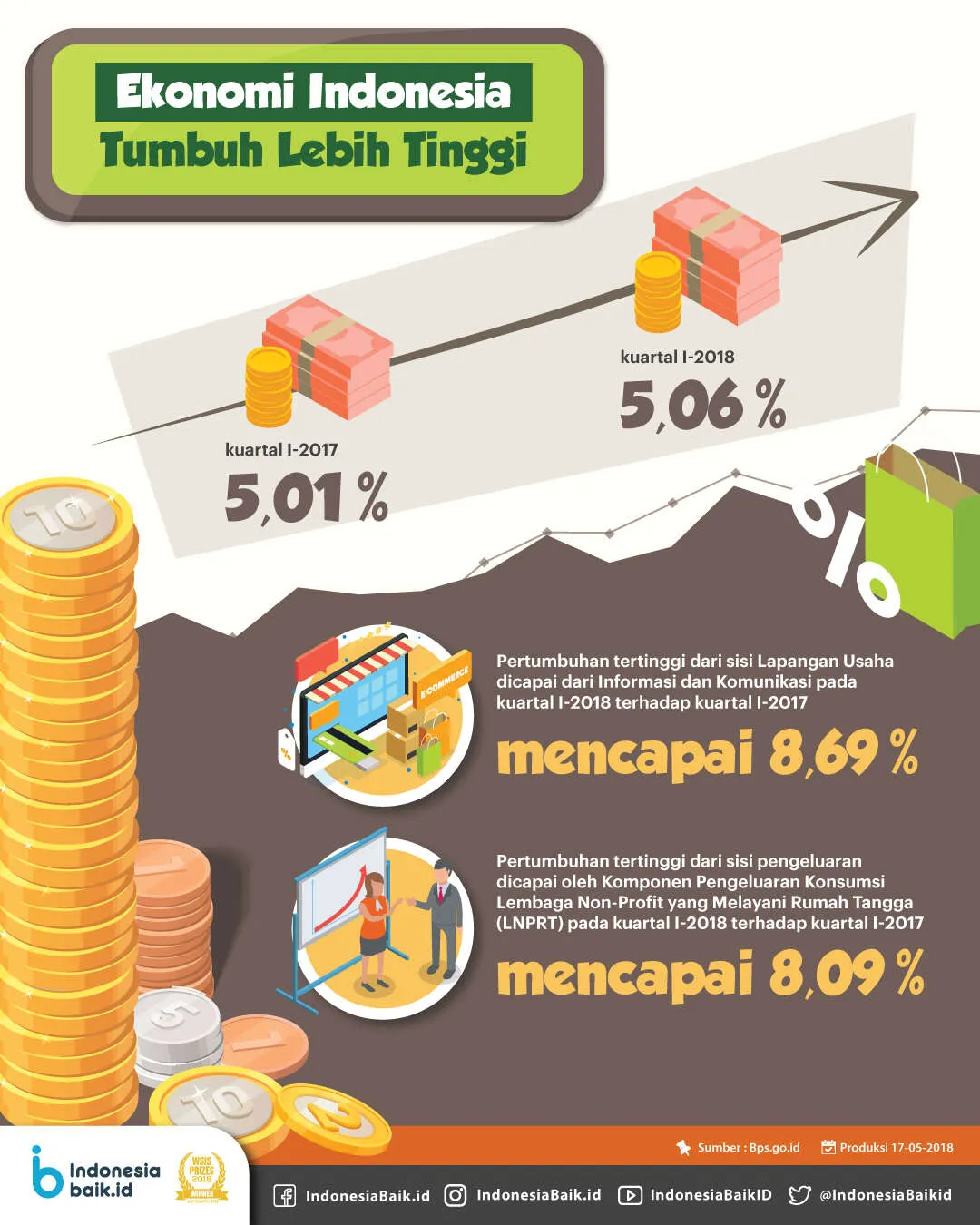 Indonesiabaik.id - Ekonomi Indonesia pada kuartal I di tahun 2018 tumbuh 5,06 persen. Bila dibandingkan perekonomian Indonesia di kuartal I pada tahun 2017, hal ini mengalami peningkatan yang cukup baik. Pada tahun lalu, ekonomi Indonesia tumbuh sebesar 5,01 persen.