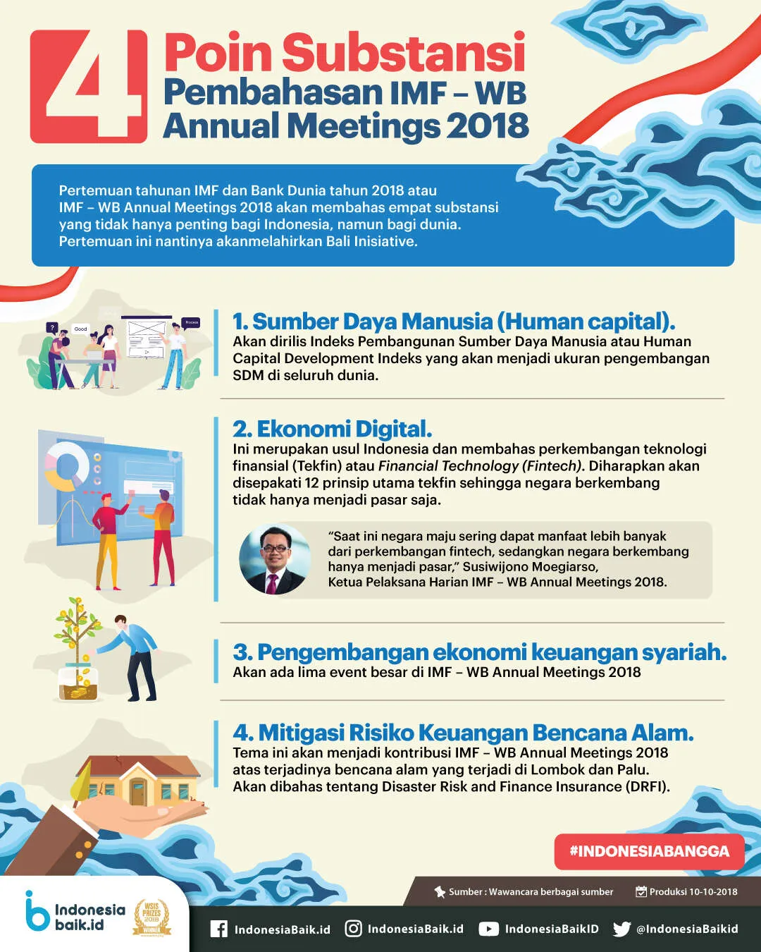 Indonesiabaik.id - Momentum pertemuan tahunan IMF-Bank Dunia di Bali akan dimanfaatkan oleh pemerintah Indonesia dengan membahas beberapa isu utama dan substansial dan nantinya akan melahirkan Bali Inisiative. Isu tersebut diantaranya mengenai Sumber Daya Manusia (Human Capital), Ekonomi Digital, dan Pengembangan Ekonomi Keuangan Syariah.