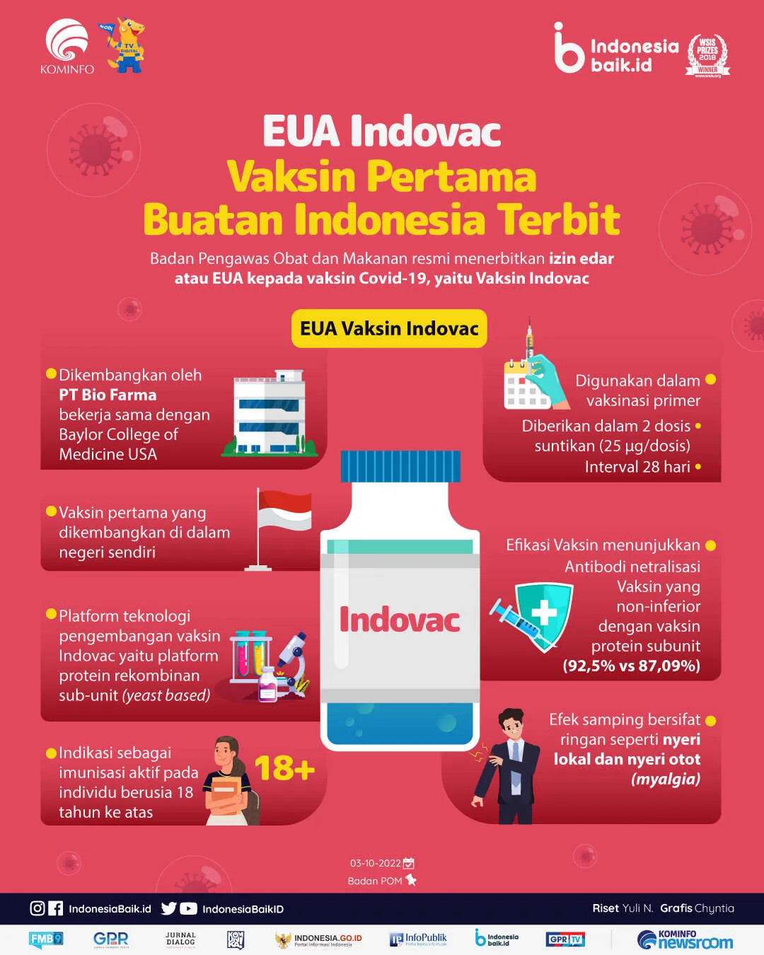 Indonesiabaik.id - The COVID-19 vaccine Indovac has received an Emergency Used Authorization (EUA) from the Food and Drug Supervisory Agency (BPOM).