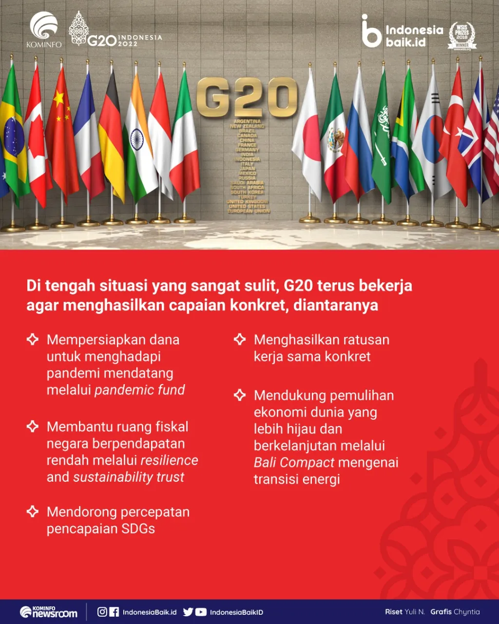 Presiden pun berharap G20 dapat terus menjadi katalis pemulihan ekonomi yang inklusif. Presiden menyampaikan, di tengah situasi yang sangat sulit, G20 terus bekerja agar menghasilkan capaian konkret, mempersiapkan dana untuk menghadapi pandemi mendatang melalui pandemic fund, membantu ruang fiskal negara berpendapatan rendah melalui resilience and sustainability trust, mendorong percepatan pencapaian SDGs, menghasilkan ratusan kerja sama konkret, serta mendukung pemulihan ekonomi dunia yang lebih hijau dan berkelanjutan melalui Bali Compact mengenai transisi energi.