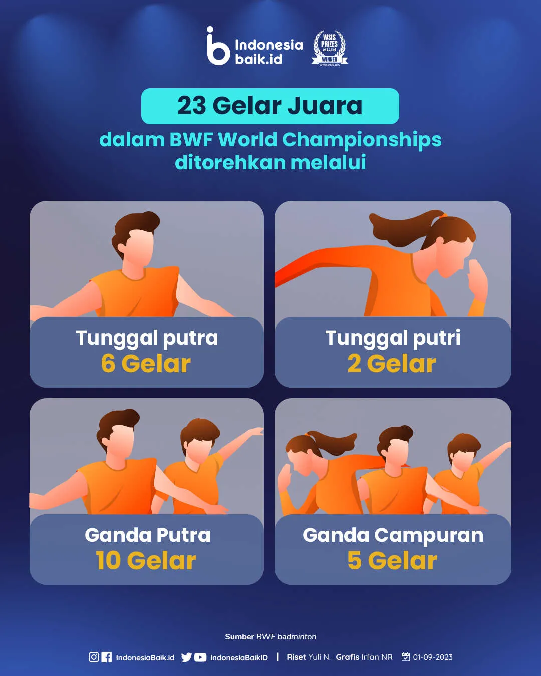 Nah, jika melihat negara lain, China menjadi negara yang paling banyak memboyong gelar juara BWF World Championships. Negeri Panda mencatatkan 70 gelar juara sejak tahun 1977 hingga 2023. Secara rinci, China meraih 14 gelar juara tunggal putra. Sebanyak 15 gelar juara diraih China di kategori tunggal putri.
