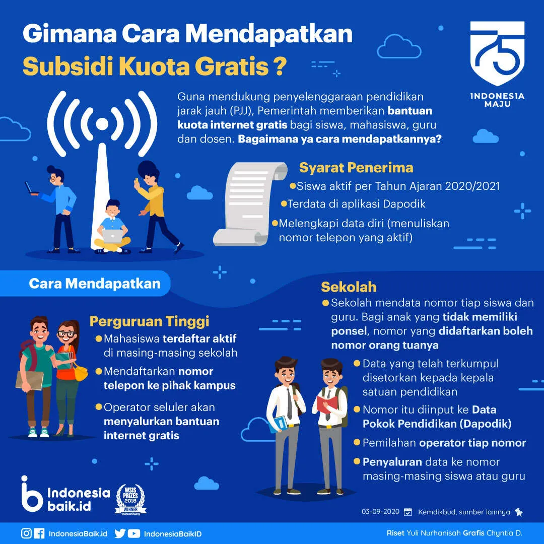 Kuota internet gratis tersebut akan langsung diberikan langsung ke nomor telepon seluler siswa dan guru. Subsidi kuota internet untuk siswa, guru, mahasiswa dan dosen akan diberikan mulai dari September hingga Desember 2020.