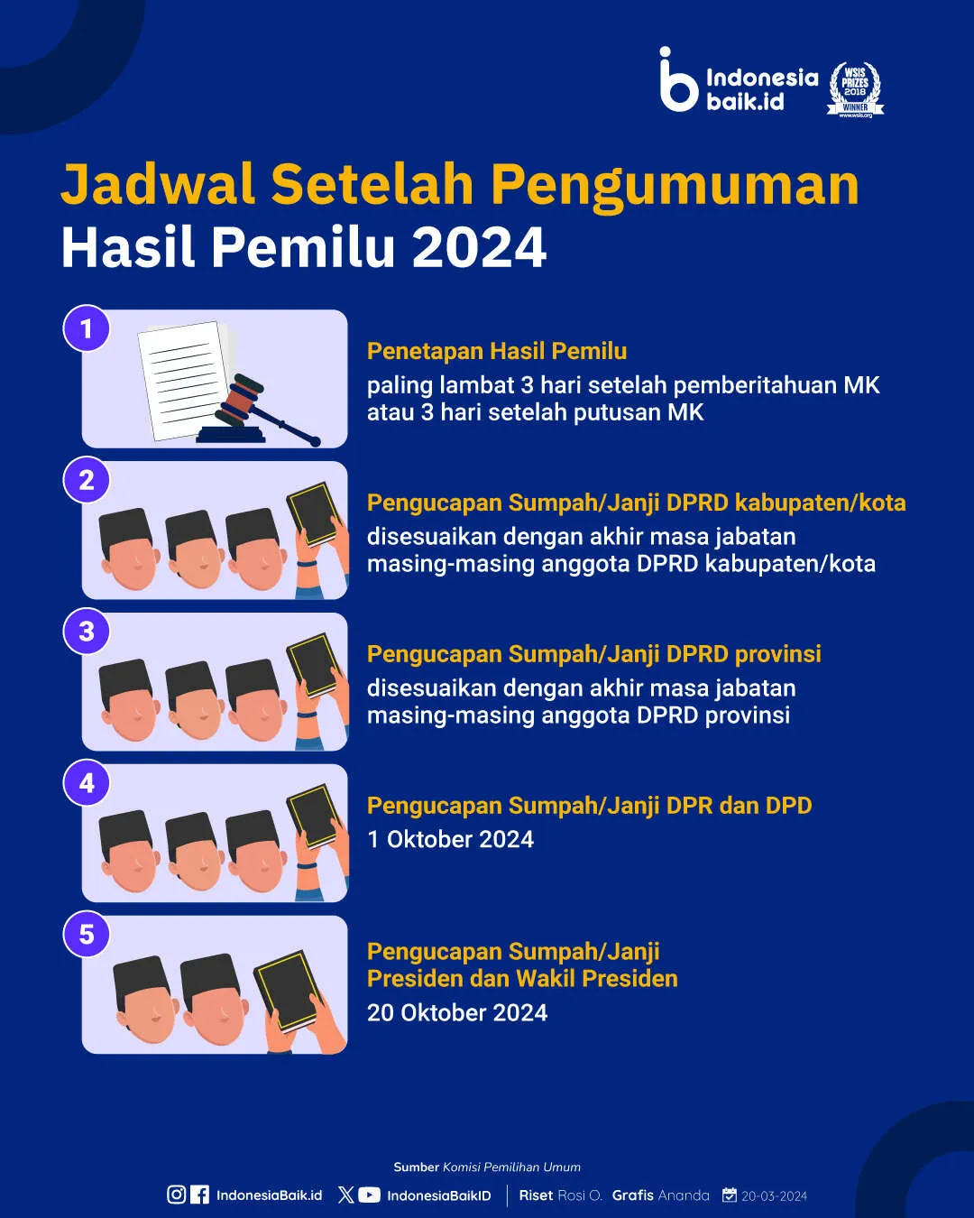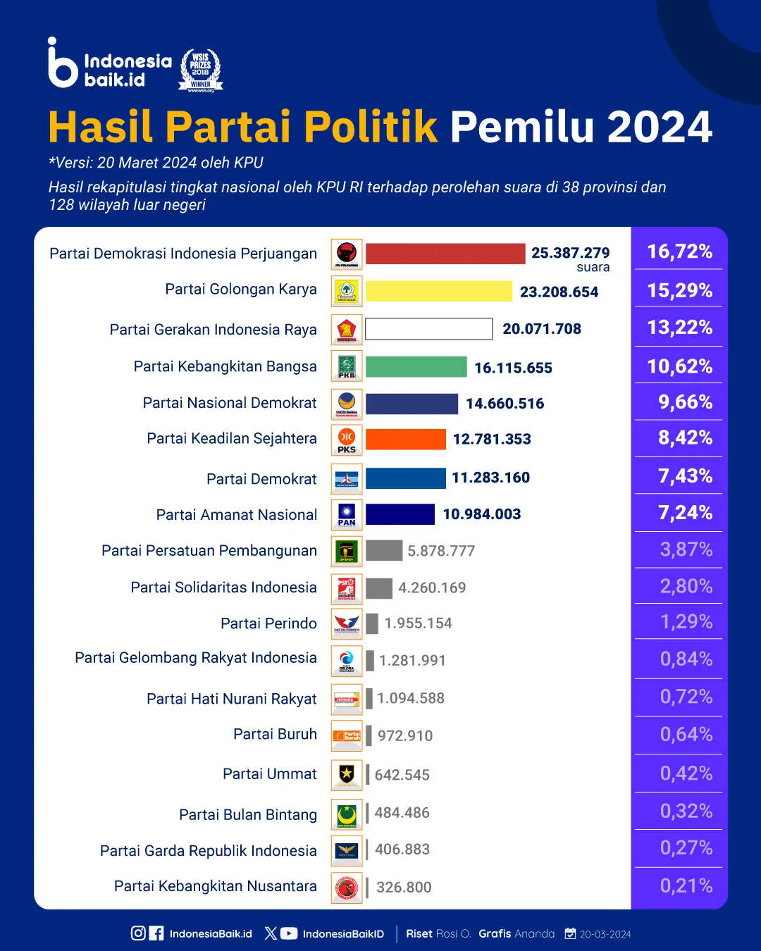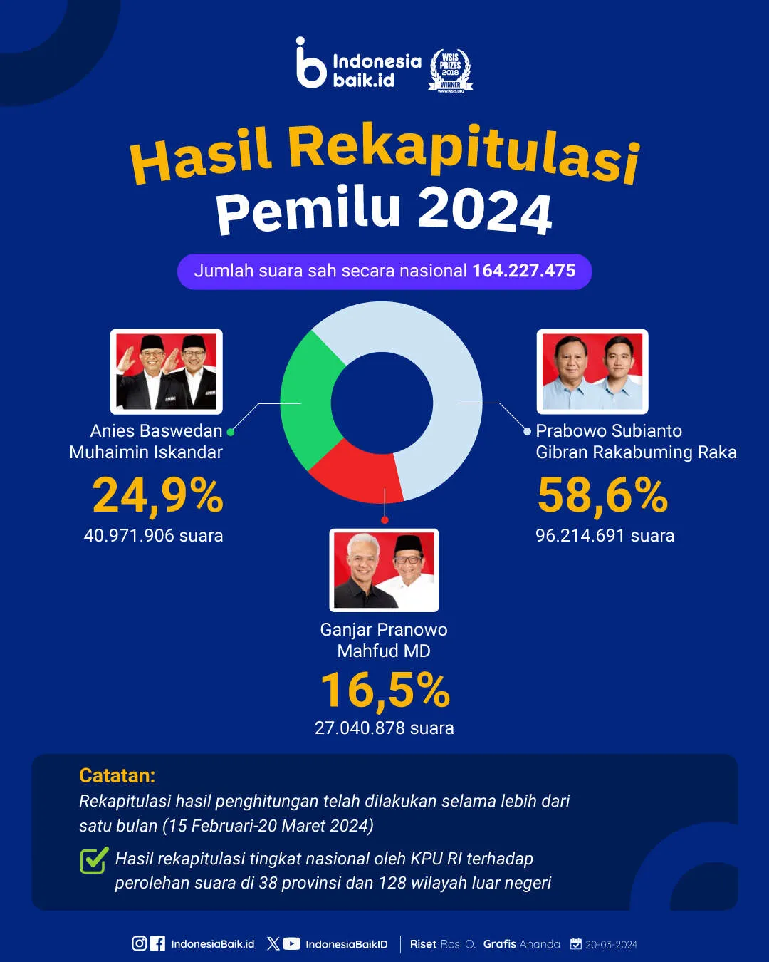 indonesiabaik.id — Komisi Pemilihan Umum (KPU) RI mengumumkan hasil Pemilu 2024 pada Rabu (20/3/2024).