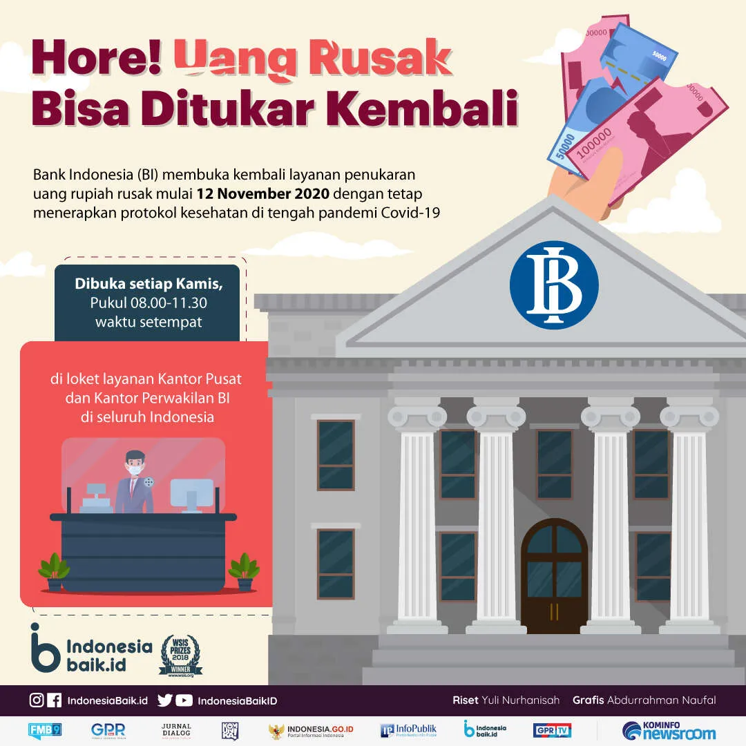 Indonesiabaik.id - Bank Indonesia (BI) membuka kembali layanan penukaran uang rupiah rusak mulai 12 November 2020 di Kantor Pusat dan Kantor Perwakilan BI di seluruh Indonesia. Penukaran uang rusak dibuka setiap hari Kamis, pukul 08.00-11.30 waktu setempat di loket layanan BI.