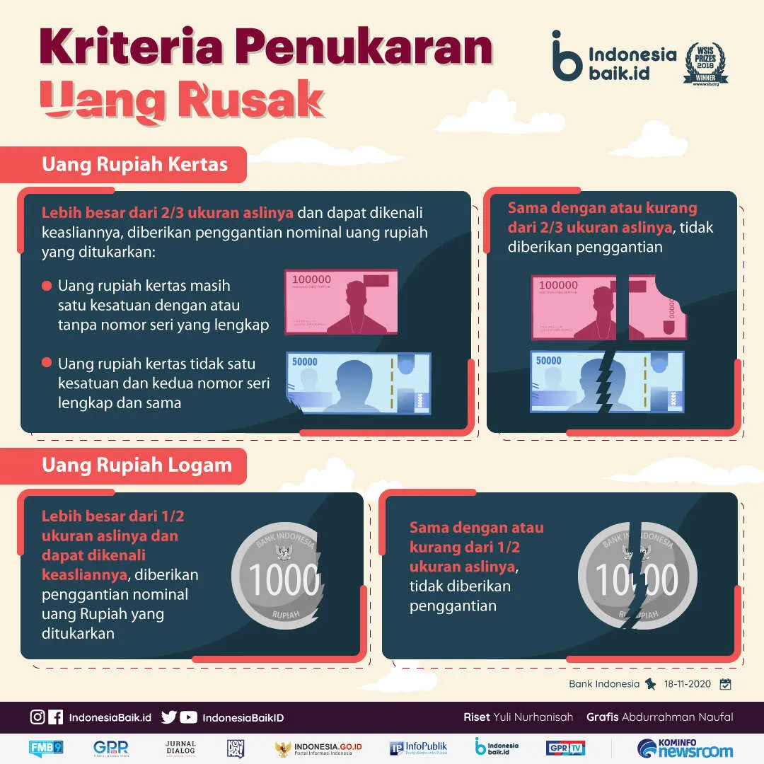 Kriteria uang rupiah kertas dan logam rusak yang diberikan penggantian sesuai dengan nilai nominal berlaku yaitu sebagai berikut: