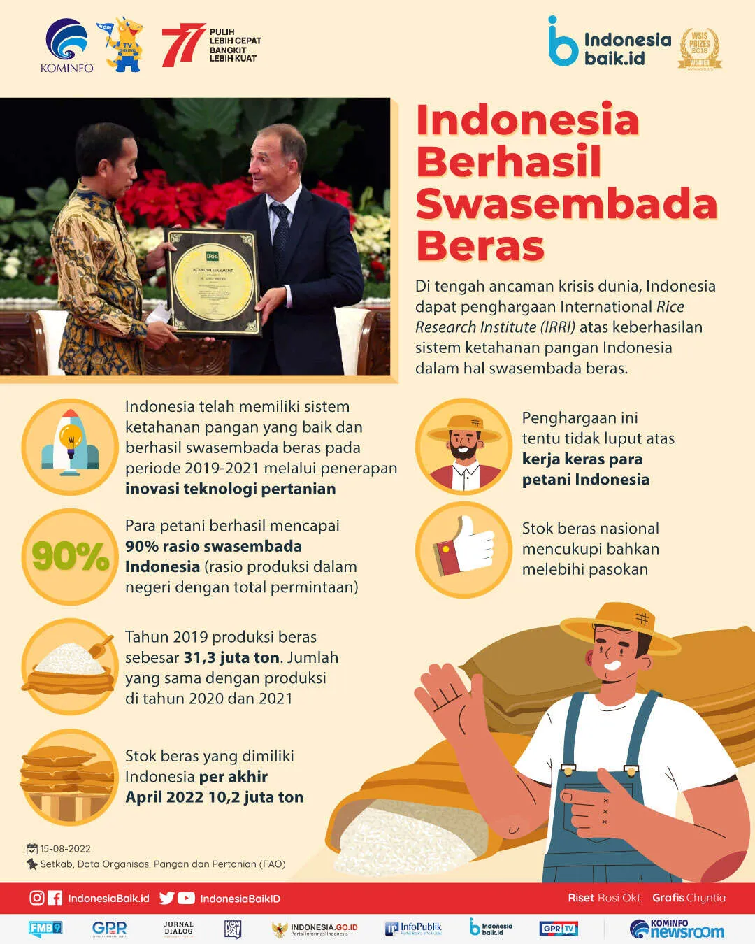 indonesiabaik.id - In the face of a potential global crisis, Indonesia received an award from the International Rice Research Institute (IRRI) for the effectiveness of its rice self-sufficiency system.