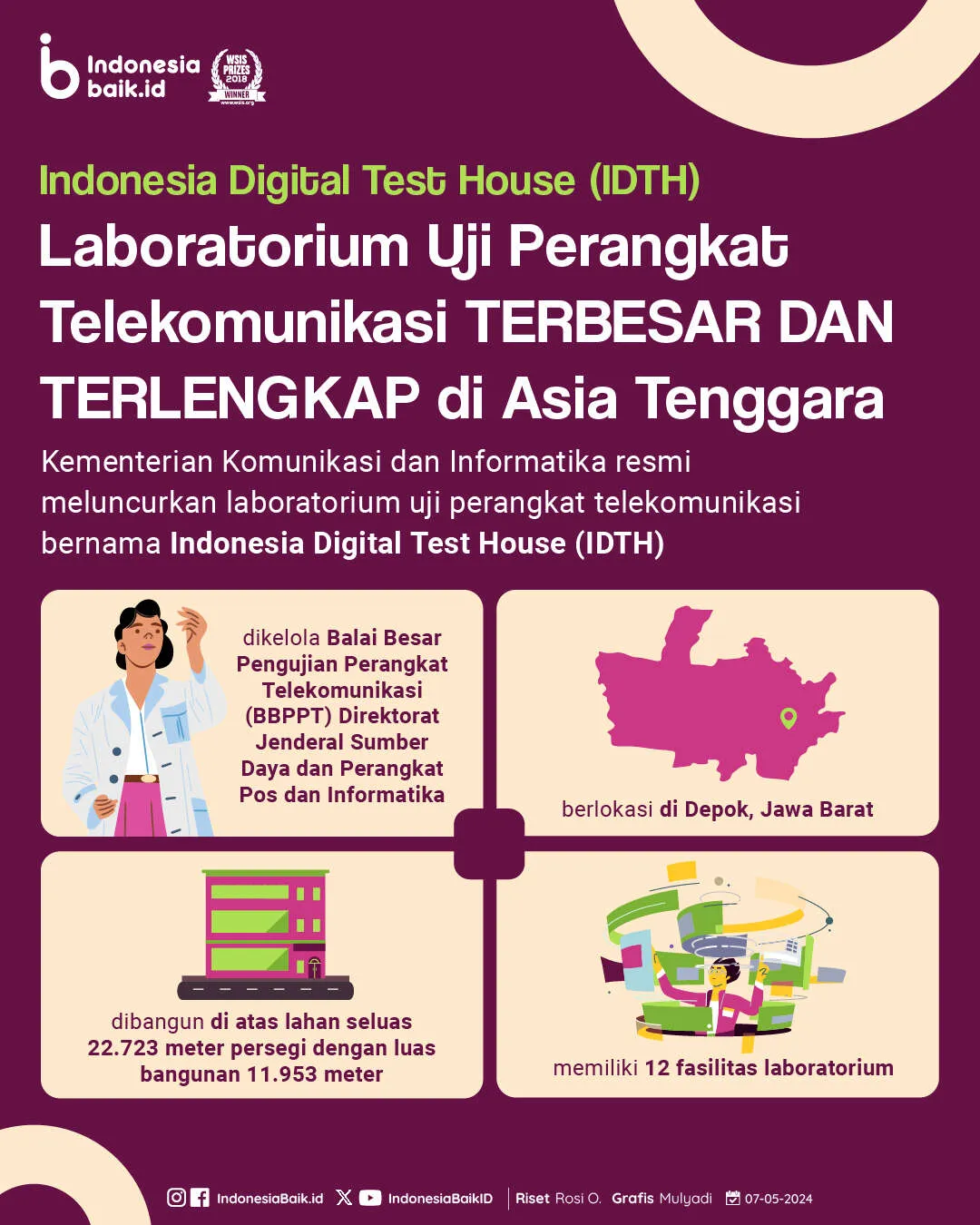 indonesabaik.id - Presiden Republik Indonesia, Joko Widodo meresmikan Balai Besar Pengujian Perangkat Telekomunikasi (BBPPT) atau Indonesia Digital Test House (IDTH) pada Selasa (7/5/2024). Balai uji perangkat telekomunikasi yang berlokasi di Tapos, Depok, Jawa Barat menjadi laboratorium terlengkap dan terbesar di Asia Tenggara.