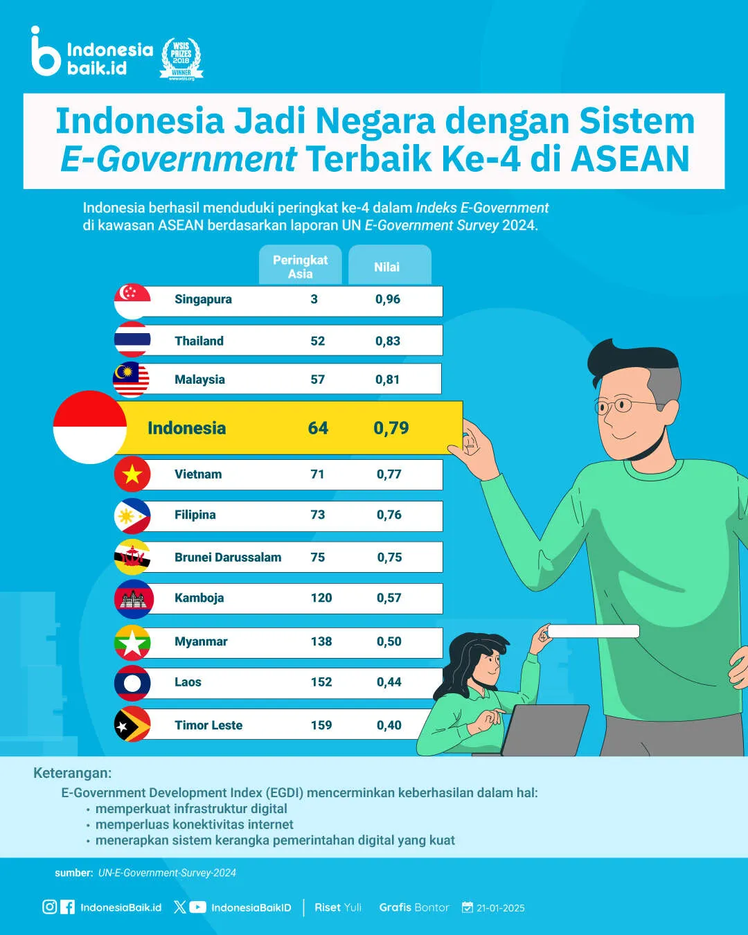 Indonesiabaik.id - Dalam laporan terbaru UN E-Government Survey 2024, Indonesia berhasil mencatatkan prestasi gemilang dengan menduduki peringkat ke-4 sebagai negara dengan sistem e-government terbaik di kawasan ASEAN.