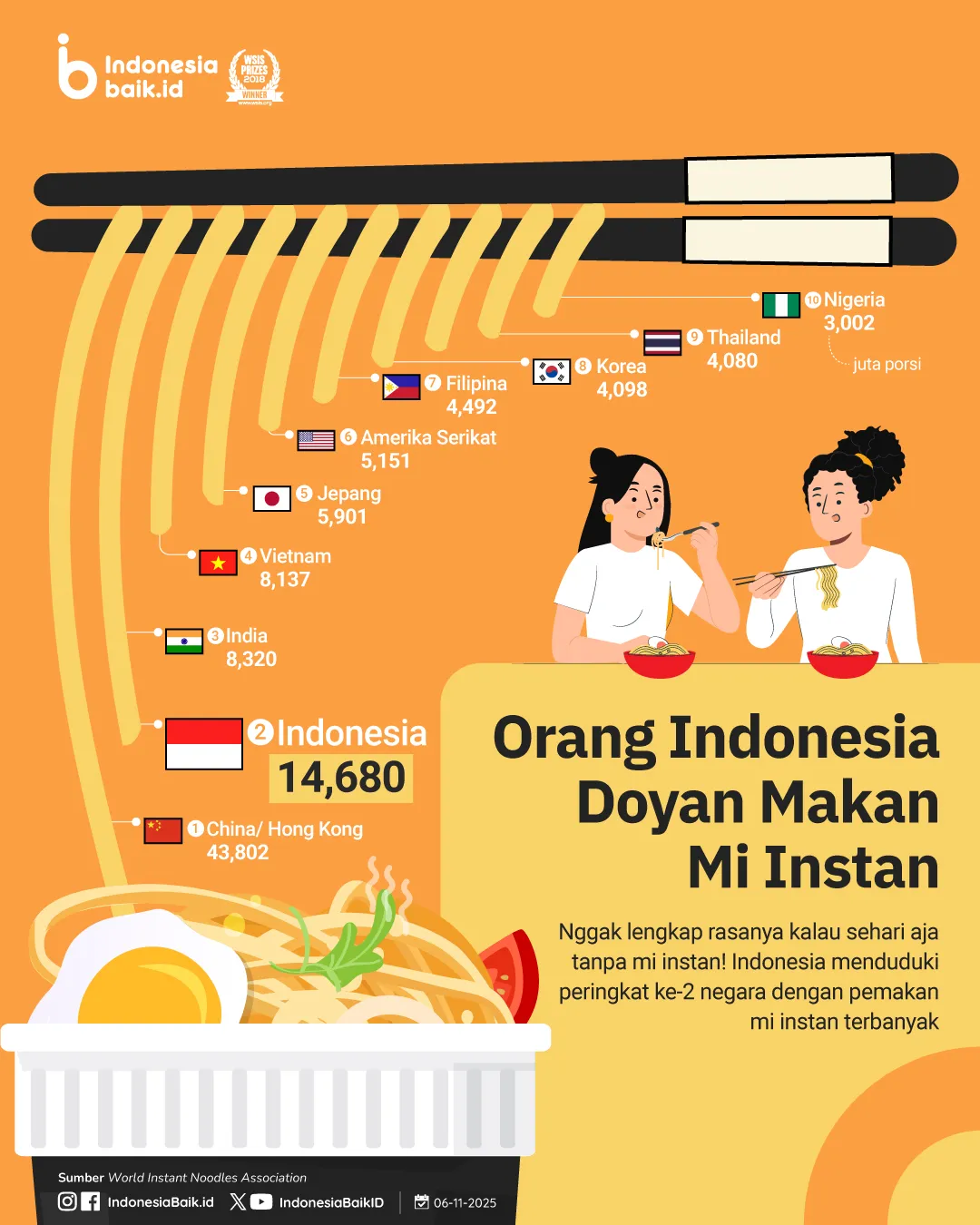 Cinta masyarakat Indonesia pada mi instan juga tercermin dalam data global. Berdasarkan laporan World Instant Noodles Association (WINA) tahun 2024, Indonesia menempati posisi kedua dunia sebagai negara dengan konsumsi mi instan terbanyak, mencapai 14,68 miliar porsi per tahun.