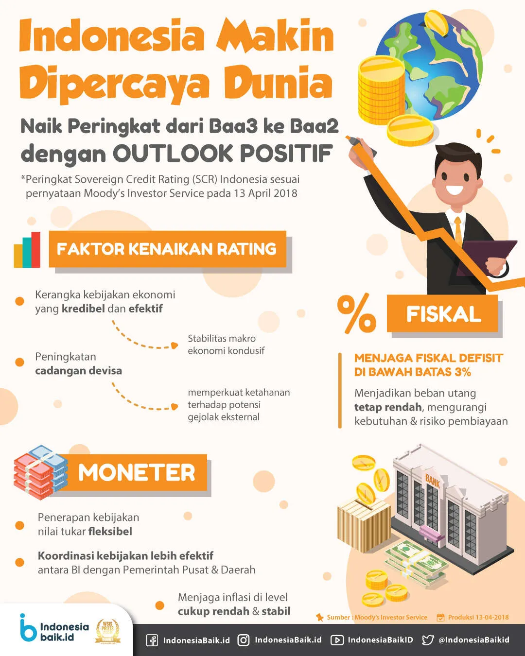 Indonesiabaik.id - Lembaga pemeringkat Moody’s Investor Service (Moody’s) telah meningkatkan peringkat Sovereign Credit Rating (SCR) Indonesia dari Baa3 (Outlook Positif) menjadi Baa2 (Outlook Stabil) pada 13 April 2018. Menurut Moody’s, faktor kunci yang mendukung keputusan menaikkan peringkat SCR Indonesia itu adalah karena kerangka kebijakan yang kredibel dan efektif yang dinilai kondusif bagi stabilitas makro ekonomi.