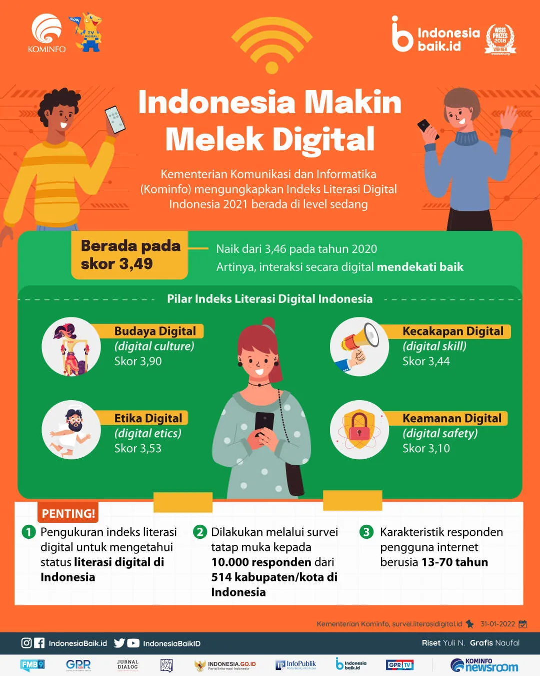 Indonesiabaik.id - Kementerian Komunikasi dan Informatika (Kominfo) menggelar survei terhadap perilaku literasi digital masyarakat di Indonesia. Pengukuran Indeks Literasi Digital 2021 dilakukan melalui survei tatap muka kepada 10.000 responden dari 514 kabupaten/Kota di Indonesia. Responden adalah pengguna internet berusia 13-70 tahun.