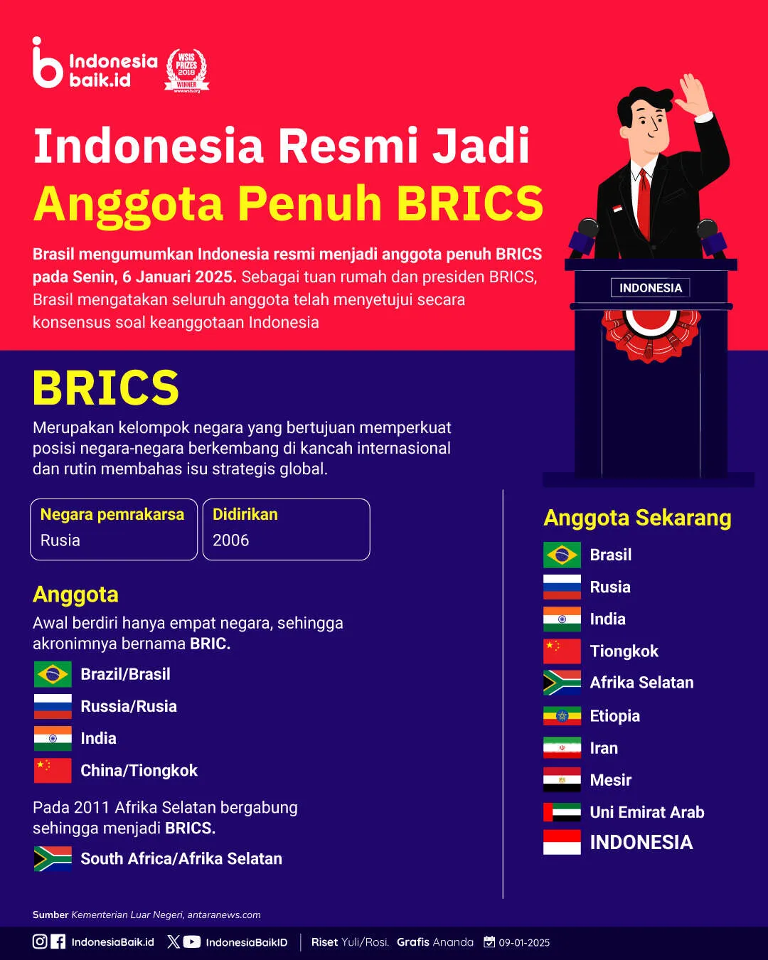 Indonesiabaik.id - Dalam sebuah langkah strategis yang signifikan, Indonesia resmi bergabung menjadi anggota penuh dalam kelompok negara berkembang terbesar di dunia, BRICS. Sebagai tuan rumah dan presiden BRICS, Brasil mengatakan seluruh anggota telah menyetujui secara konsensus soal keanggotaan Indonesia.