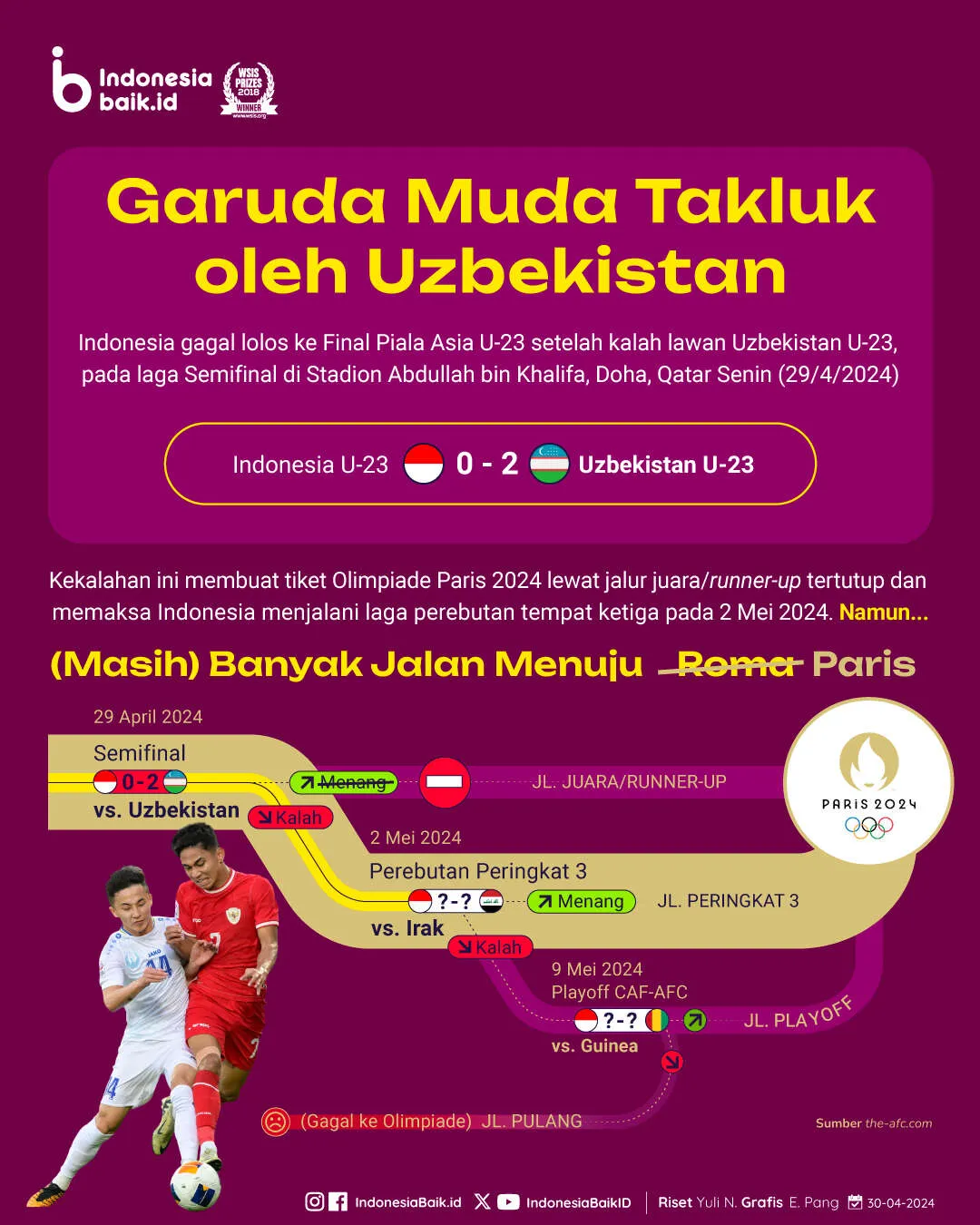 indonesiabaik.id - Timnas U-23 Indonesia gagal lolos ke Final Piala Asia U-23 setelah takluk oleh Uzbekistan U-23 dengan skor 2-0 pada Semifinal Piala Asia U-23 di Stadion Abdullah bin Khalifa, Senin (29/4/2024).