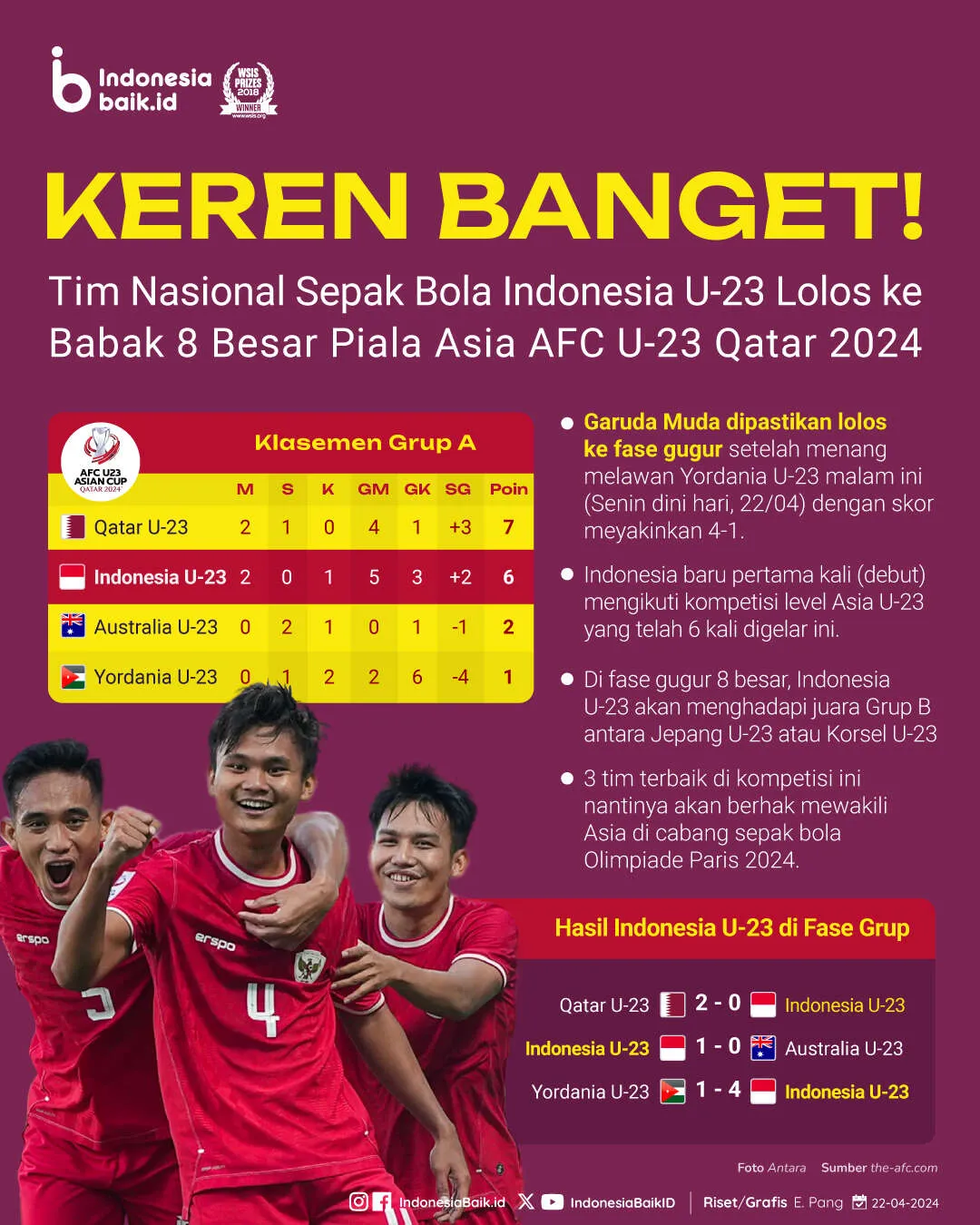indonesiabaik.id - Tim Garuda Muda Indonesia (U-23) telah menjalani babak penyisihan grup Piala Asia U-23 Qatar 2024 dengan sangat membanggakan. Timnas U-23 dipastikan lolos ke fase gugur setelah menang melawan Yordania U-23 malam ini (Senin dini hari Waktu Indonesia Barat, 22/04) dengan skor meyakinkan 4-1.