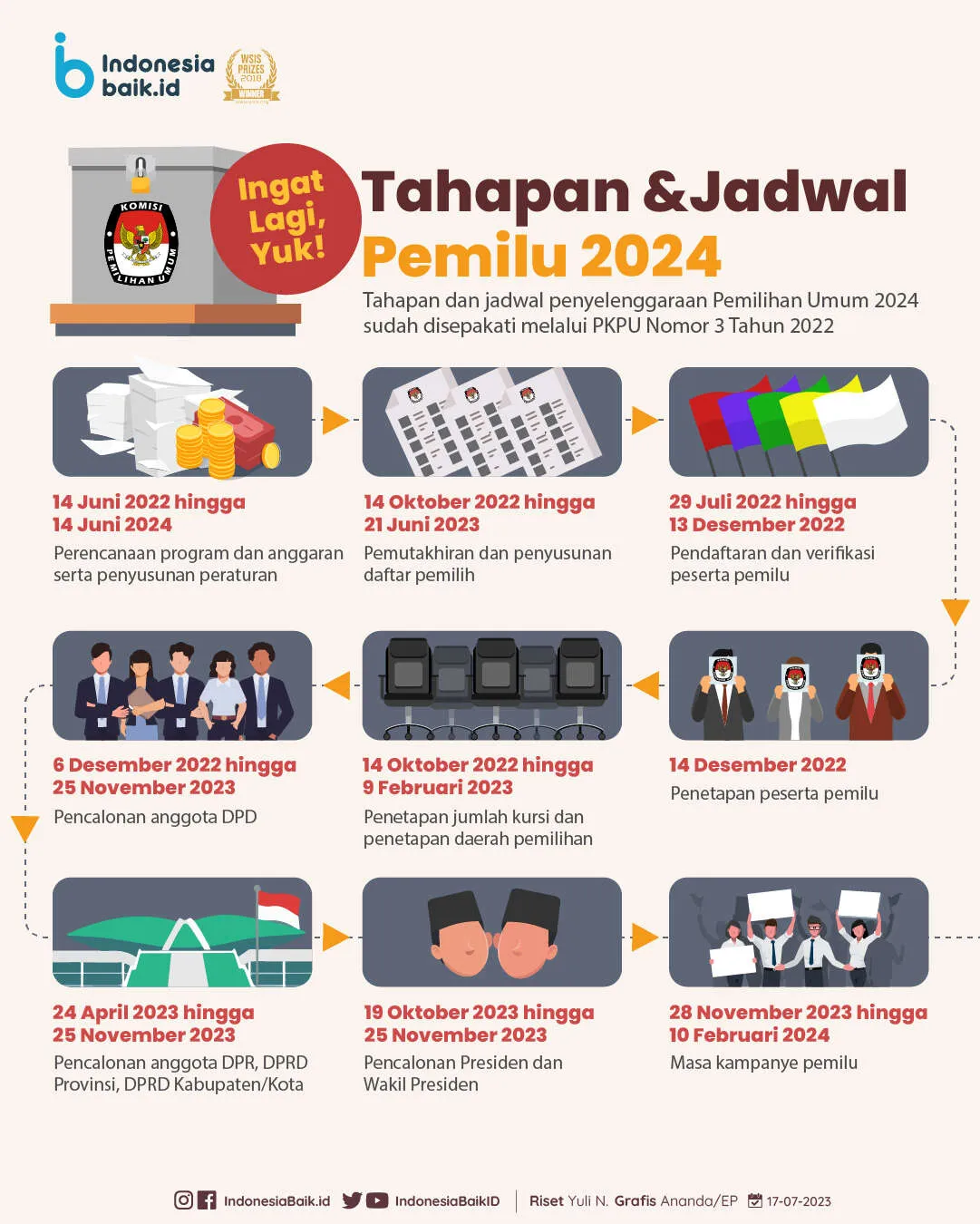 Indonesiabaik.id - Pemilu 2024 sudah di depan mata loh! Peraturan Komisi Pemilihan Umum (PKPU) untuk penyelenggaraan Pemilu 2024 telah sah diundangkan melalui PKPU Nomor 3 Tahun 2022. Artinya, tahapan dan jadwal penyelenggaraan Pemilihan Umum 2024 sudah disepakati.