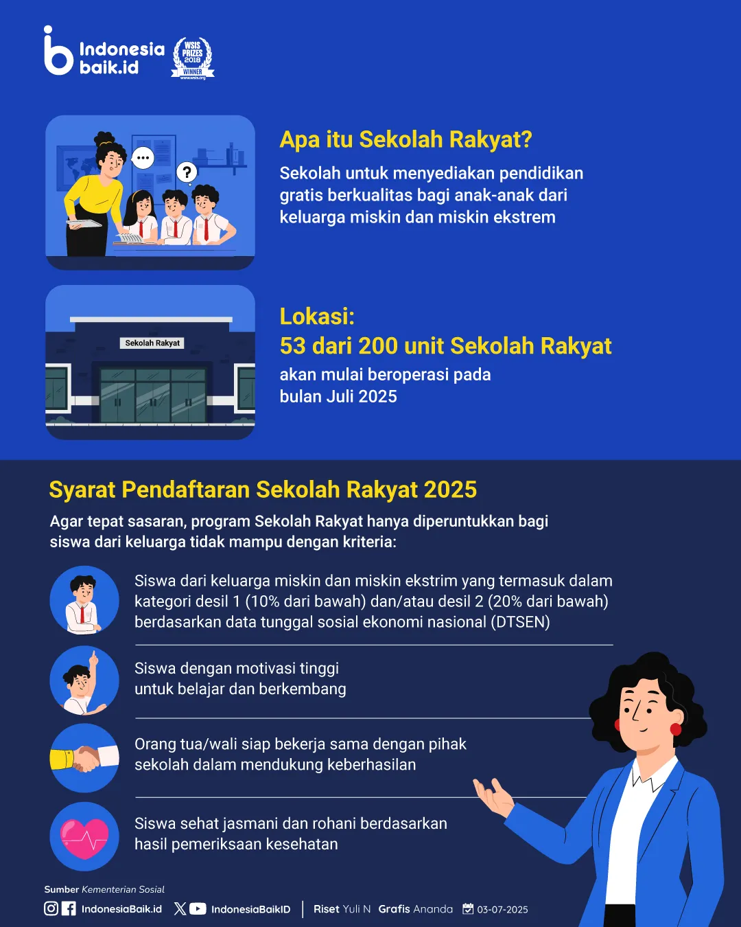 indonesiabaik.id — Temukan syarat lengkap pendaftaran Sekolah Rakyat 2025 dari Kemensos. Program pendidikan gratis ini ditujukan bagi anak-anak dari keluarga kurang mampu sesuai data sosial ekonomi nasional.