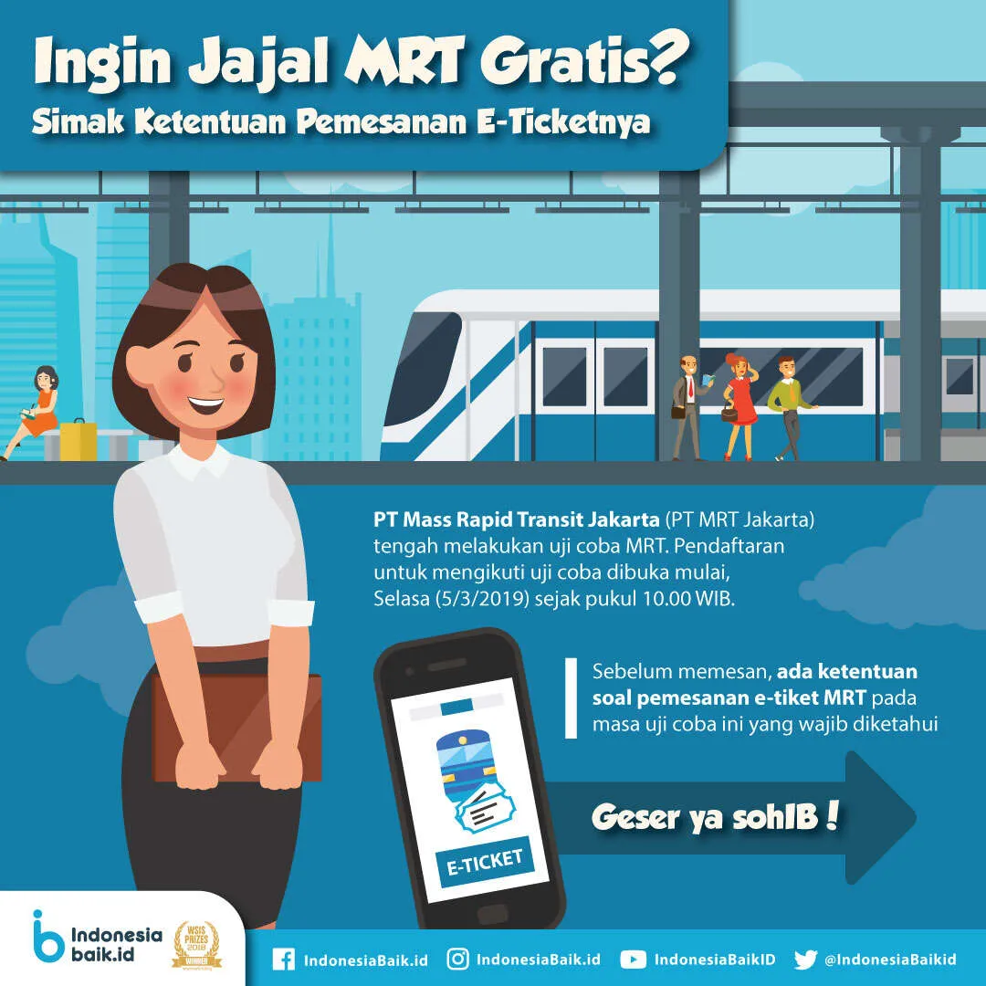 Indonesiabaik.id - PT Mass Rapid Transit Jakarta (PT MRT Jakarta) segera melakukan uji coba angkutan massal di Ibu Kota. Pendaftaran untuk mengikuti uji coba dibuka mulai hari ini, Selasa (5/3/2019) sejak pukul 10.00 WIB. Adapun masa uji coba dilakukan pada 12 Maret 2019 hingga 24 Maret 2019 pukul 08.00—16.00 WIB.