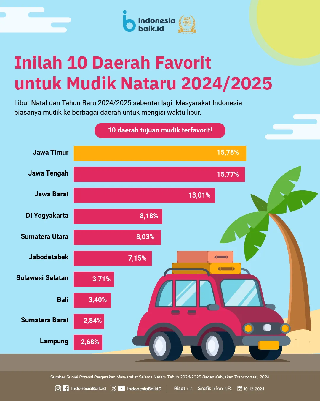 Libur Natal dan Tahun Baru 2024/2025 sudah di depan mata. Seperti tradisi dari tahun ke tahun, masyarakat Indonesia biasanya akan mudik ke berbagai daerah untuk mengisi waktu liburan mereka. Berdasarkan data pergerakan nasional, berikut adalah 10 daerah tujuan mudik terfavorit: