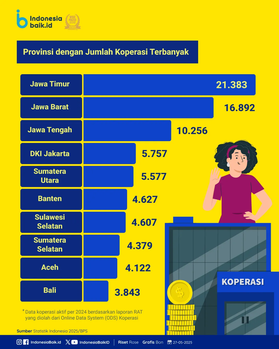 Sebut saja Jawa Timur, menempati posisi pertama dengan jumlah koperasi terbanyak, yakni 21.383 unit. Disusul oleh Jawa Barat dan Jawa Tengah dengan masing-masing berjumlah 16.892 koperasi dan 10.256 koperasi.