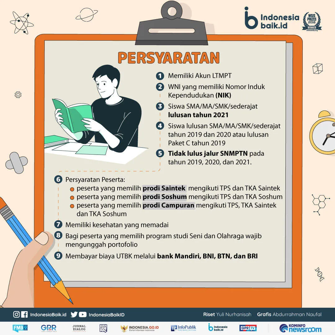 Persyaratan bagi peserta UTBK-SBMPTN1. Memiliki Akun LTMPT. 2. Warga Negara Indonesia (WNI) yang memiliki Nomor Induk Kependudukan (NIK) 3. Siswa SMA/MA/SMK/sederajat lulusan tahun 2021 harus memiliki Surat Keterangan Siswa SMA/MA/SMK Kelas 12 pada tahun 2021 atau peserta didik Paket C tahun 2021 dengan umur maksimal 25 tahun (per 1 Juli 2021). 4. Siswa lulusan SMA/MA/SMK/sederajat tahun 2019 dan 2020 atau lulusan Paket C tahun 2019 dan 2020 harus memiliki ijazah dengan umur maksimal 25 tahun (per 1 Juli 2021). Bagi lulusan SMA sederajat dari luar negeri harus memiliki ijazah yang sudah disetarakan. 5. Tidak lulus jalur SNMPTN pada tahun 2019, 2020, dan 2021. 6. Persyaratan Peserta: