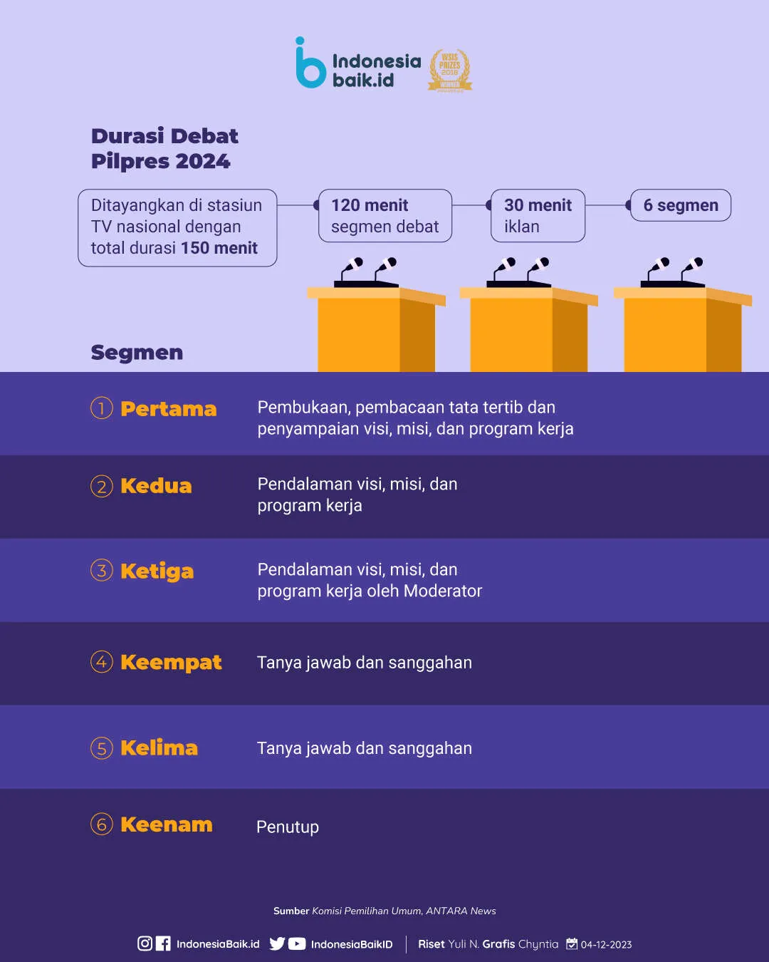 Mengacu kepada Keputusan KPU Nomor 1621 Tahun 2023, debat capres-cawapres akan berlangsung selama 150 menit. Dari jumlah itu, 120 menit untuk segmen debat dan 30 menit untuk iklan.