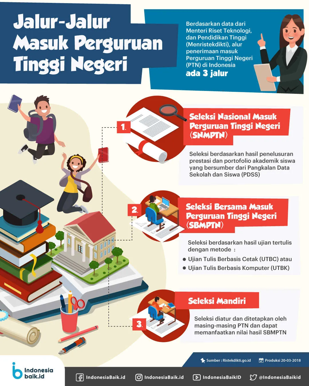 Indonesiabaik.id - Kementerian Riset, Teknologi, dan Pendidikan Tinggi (Kemenristekdikti) telah membuka seleksi penerimaan mahasiswa baru untuk Perguruan Tinggi Negeri (PTN) untuk tahun 2018. Pada tahun ini seleksi dirinci menjadi tiga jalur, pertama yaitu lewat jalur Seleksi Nasional Masuk Perguruan Tinggi Negeri (SNMPTN), seleksi berdasarkan hasil penelusuran prestasi dan hasil portofolio akademik siswa yang bersumber dari Pangkalan Data Sekolah dan Siswa (PDSS).