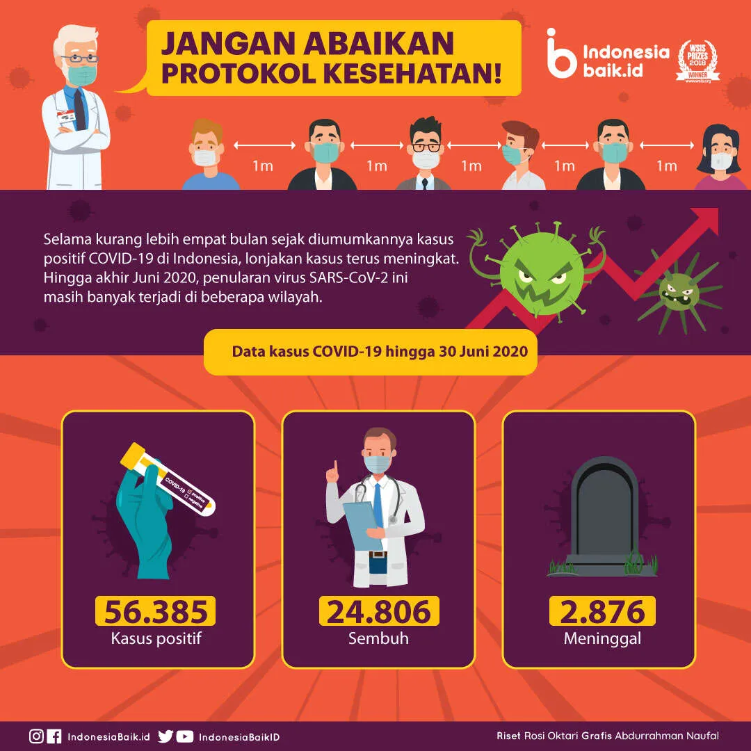 Adapun data kasus COVID-19 di Indonesia hingga 30 Juni 2020 menunjukkan, sebanyak 56.385 terkonfirmasi kasus positif, 24.806 kasus sembuh dan 2.876 kasus meninggal.