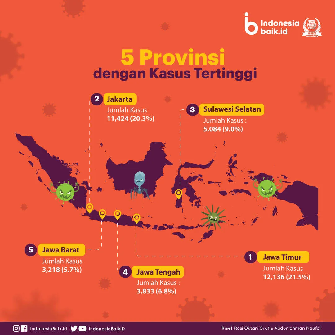 Deretan provinsi dengan peningkatan jumlah kasus tertinggi pun terpampang jelas. Hingga akhir bulan Juni, 5 provinsi dengan kasus tertinggi dicapai oleh; Jawa Timur denga jumlah kasus sebanyak 12,136 (21.5%), Jakarta dengan jumlah kasus sebanyak 11,424 (20.3%), Sulawesi Selatan dengan jumlah kasus sebanyak 5,084 (9.0%), dan Jawa Tengah yang memiliki jumlah kasus sebanyak 3,833 (6.8%) serta Jawa Barat dengan jumlah kasus sebanyak 3,218 (5.7%).