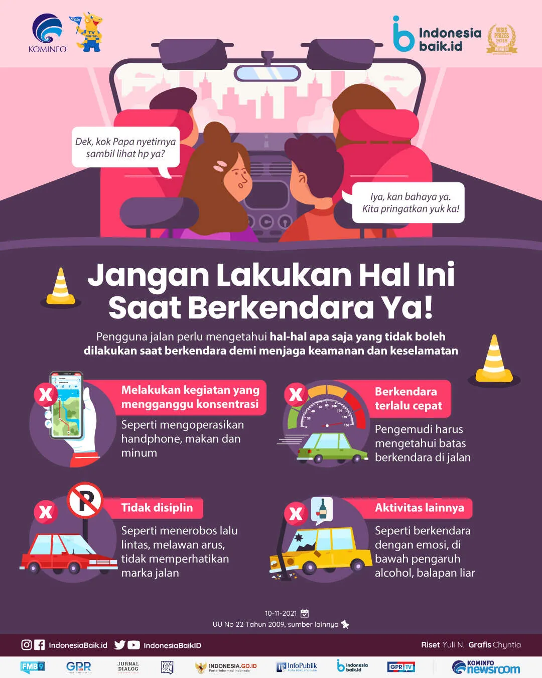Indonesiabaik.id - Tertib berlalu lintas adalah suatu kewajiban bagi semua pengguna jalan, siapa pun itu tanpa terkecuali. Oleh karena itu, pengguna jalan perlu mengetahui hal-hal apa saja yang tidak boleh dilakukan saat berkendara demi menjaga keamanan dan keselamatan.