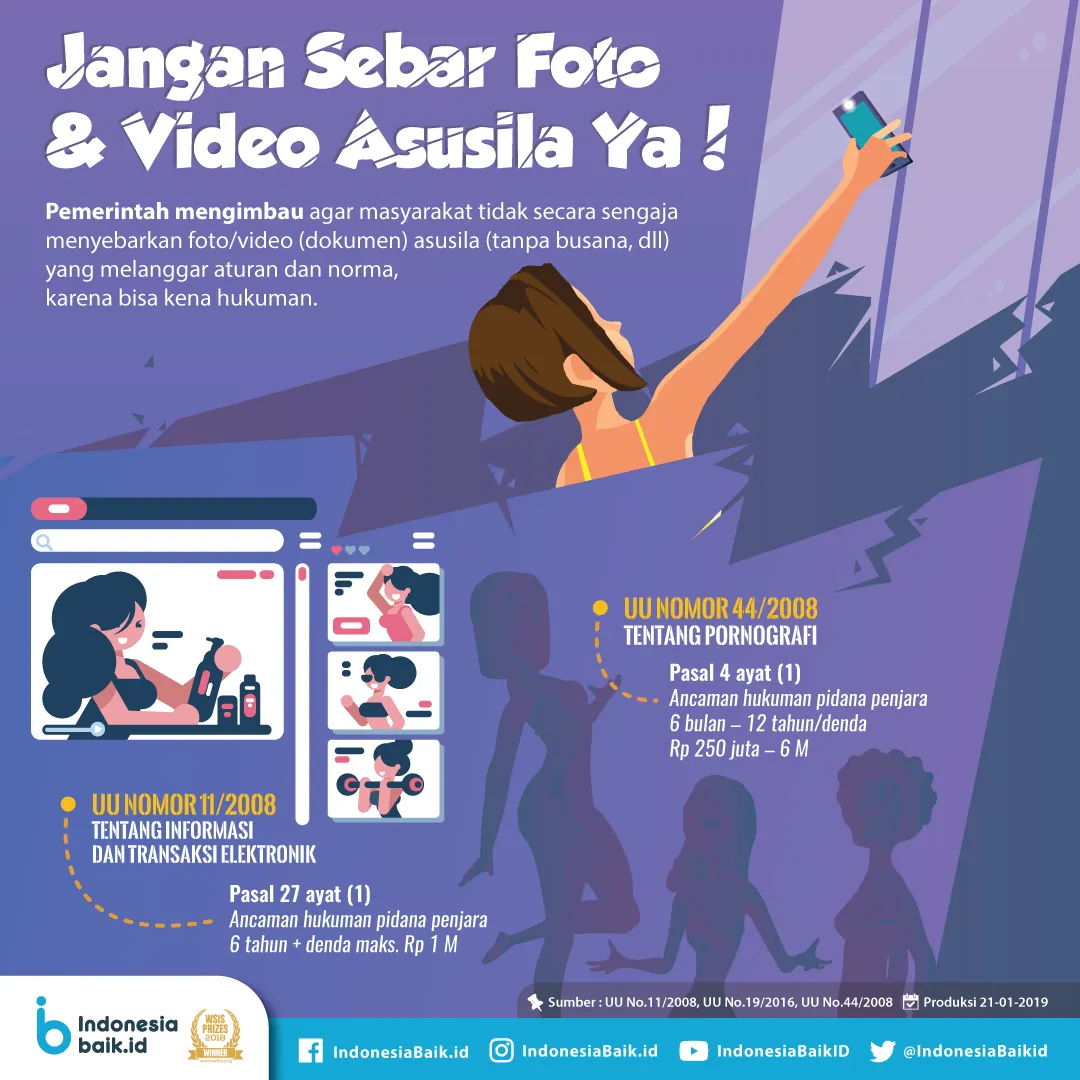 Indonesiabaik.id - Masyarakat diimbau agar tidak secara sengaja menyebarkan foto/video (dokumen) asusila (tanpa busana, dll) yang melanggar aturan dan norma yang berlaku. Karena penyebar konten asusila di media bisa kena hukuman.