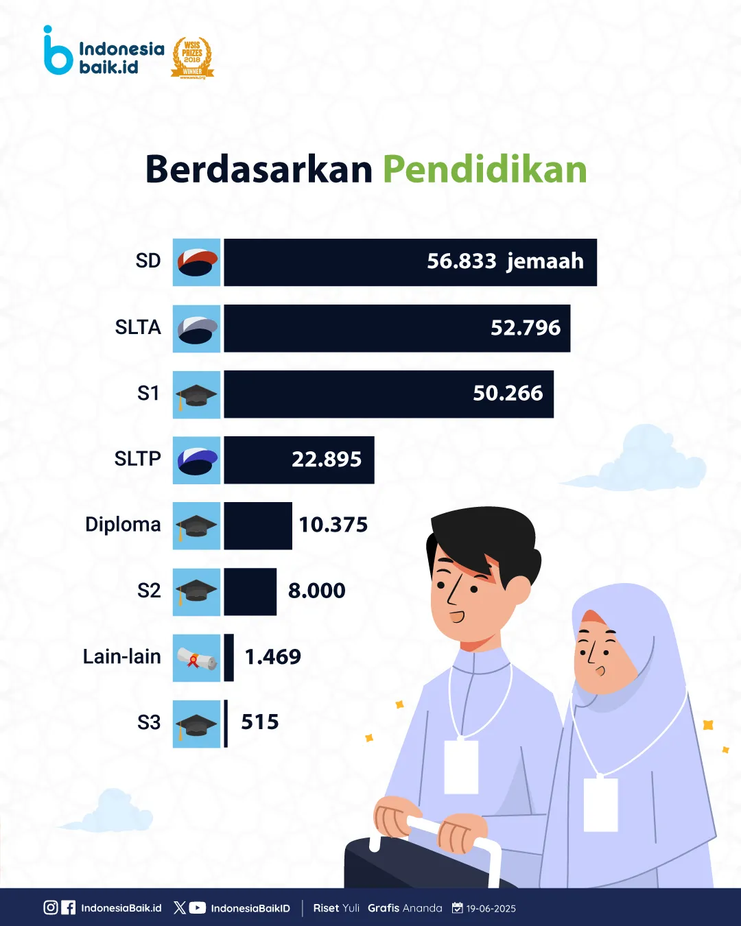 Dilihat dari latar belakang pendidikan, jemaah haji Indonesia tahun 2025 berasal dari beragam jenjang. Sebagian besar merupakan lulusan Sekolah Dasar (SD) dengan jumlah 56.833 orang, disusul oleh lulusan SLTA (52.796 orang) dan lulusan Sarjana (S1) sebanyak 50.266 orang.