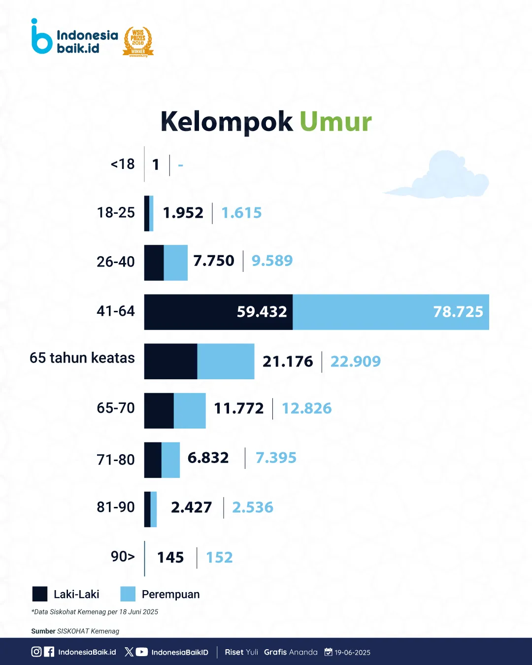 Jika dilihat dari sisi usia, mayoritas jemaah haji Indonesia tahun 2025 berada pada rentang usia produktif 41–64 tahun, yakni 59.432 laki-laki dan 78.725 perempuan.