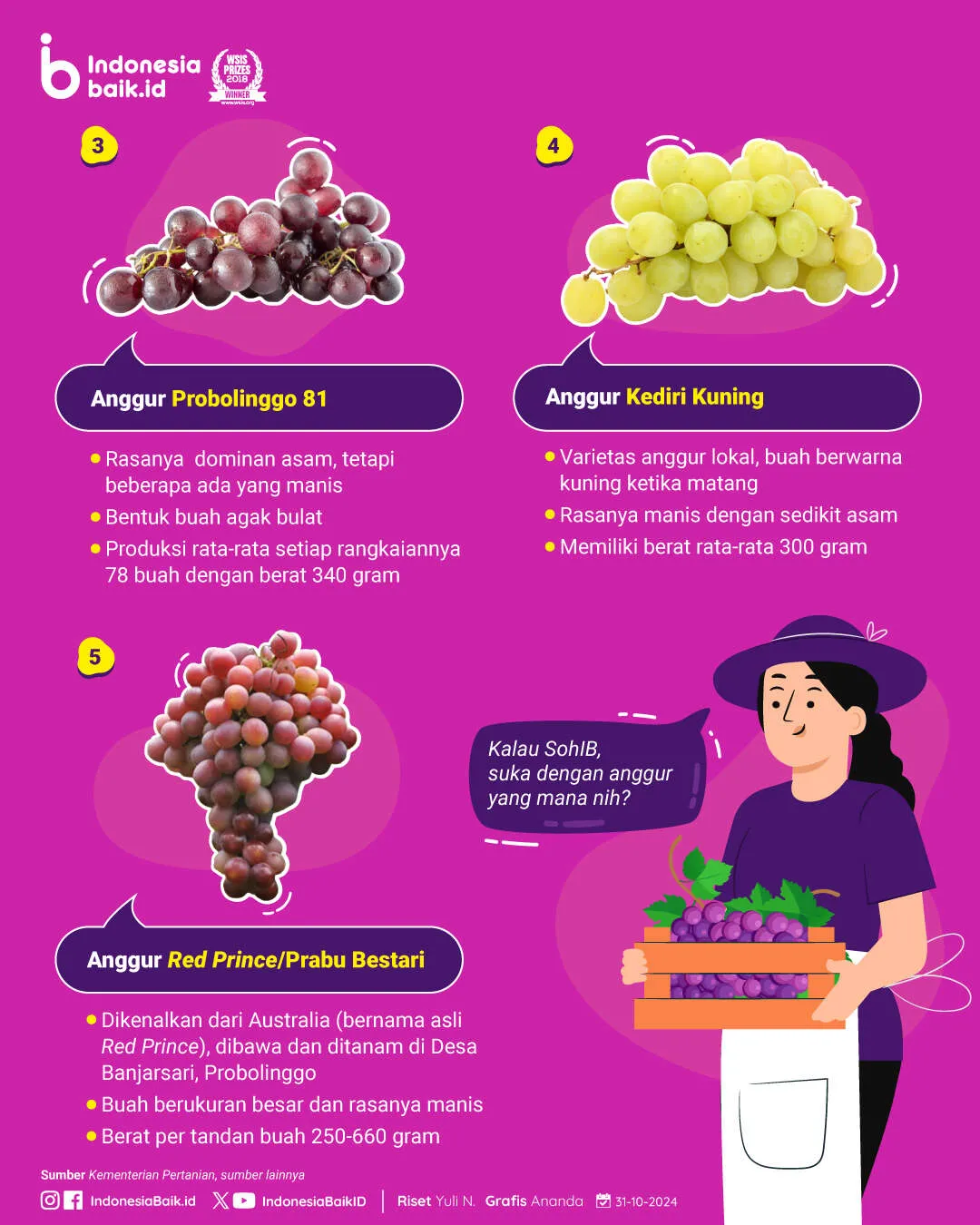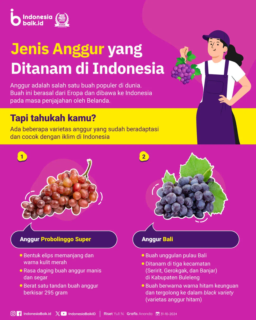 Indonesiabaik.id - Anggur adalah salah satu buah populer di dunia. Tanaman anggur berasal dari Eropa dan pada masa penjajahan dulu dibawa oleh Belanda ke Indonesia.