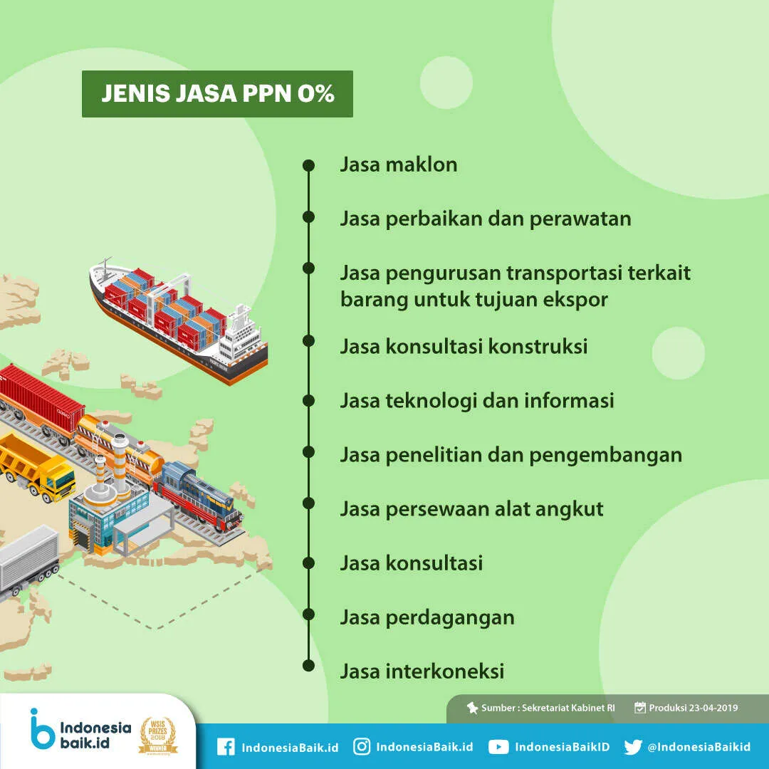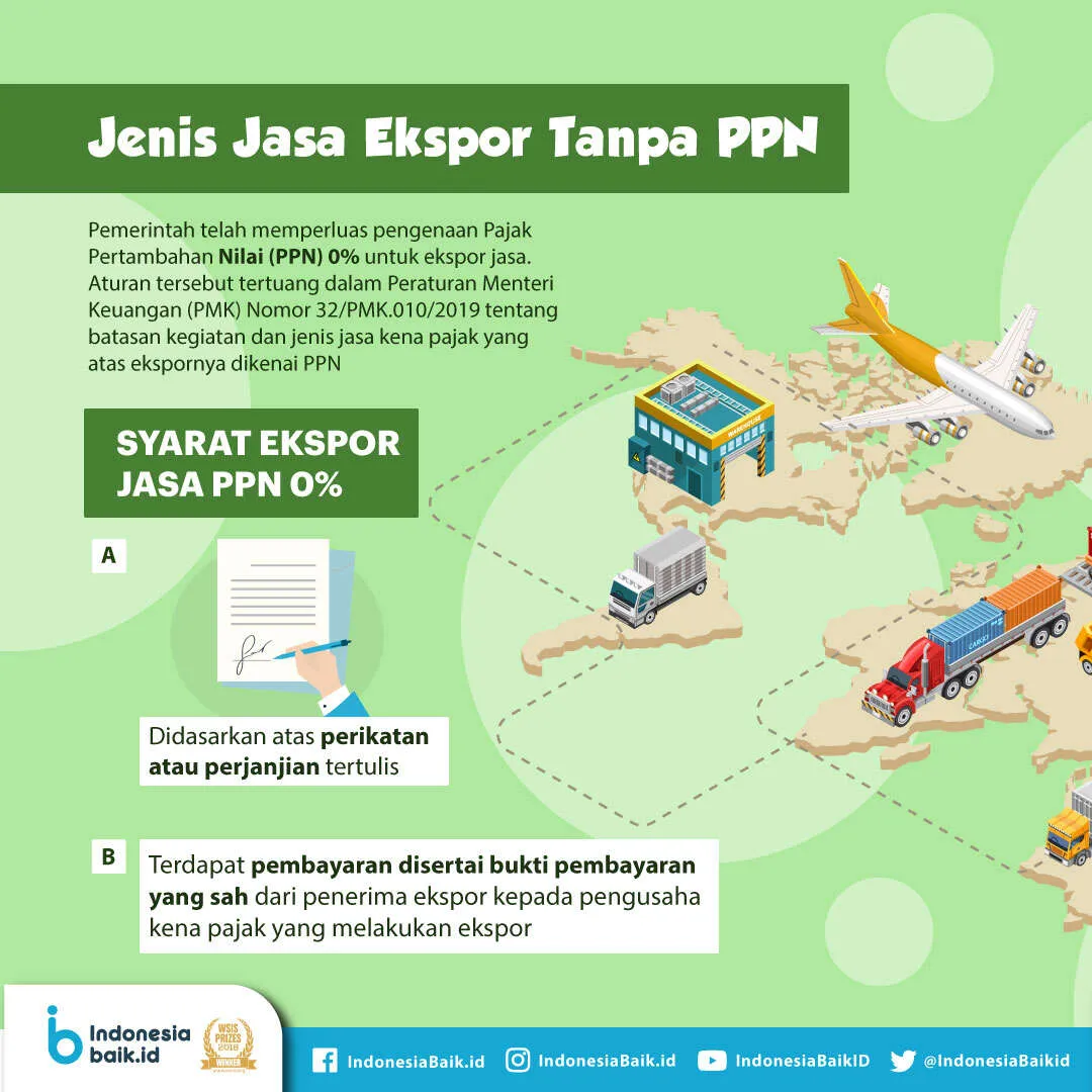 Indonesiabaik.id - Pemerintah mengeluarkan beleid baru yang memperluas pengenaan Pajak Pertambahan Nilai (PPN) 0% untuk ekspor jasa. Aturan tersebut tertuang dalam Peraturan Menteri Keuangan (PMK) Nomor 32/PMK.010/2019 tentang batasan kegiatan dan jenis jasa kena pajak yang atas ekspornya dikenai PPN.