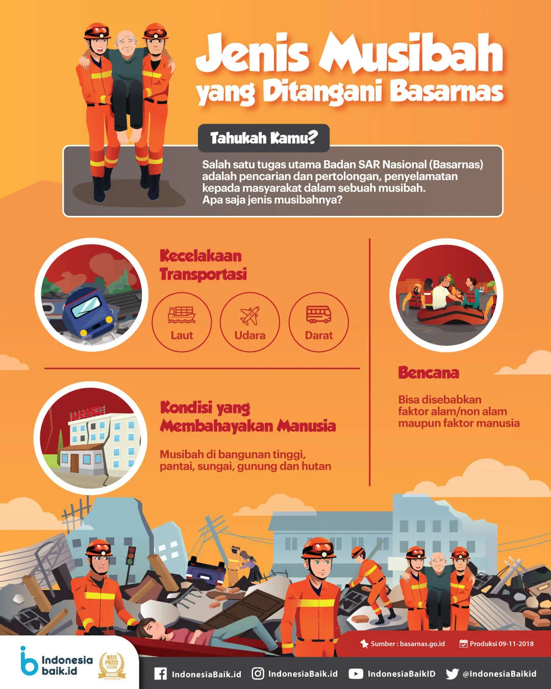 Indonesiabaik.id - Salah satu tugas utama Badan SAR Nasional (Basarnas) adalah pencarian dan pertolongan, penyelamatan, serta evakuasi kepada masyarakat dalam sebuah musibah secara andal, efektif, cepat, efisien, dan aman. Lalu apa sajakah jenis musibah yang menjadi area misi Basarnas?