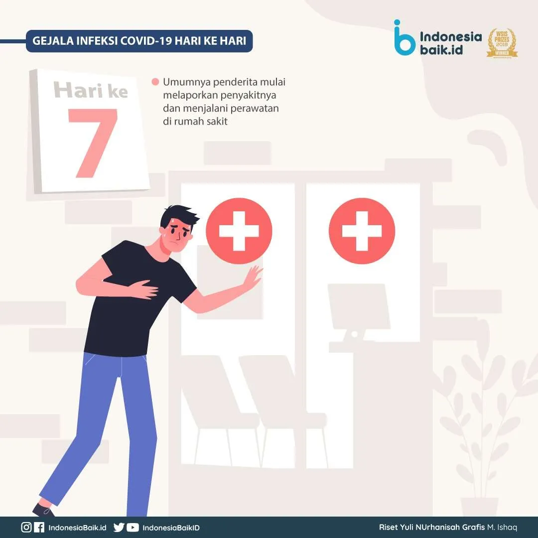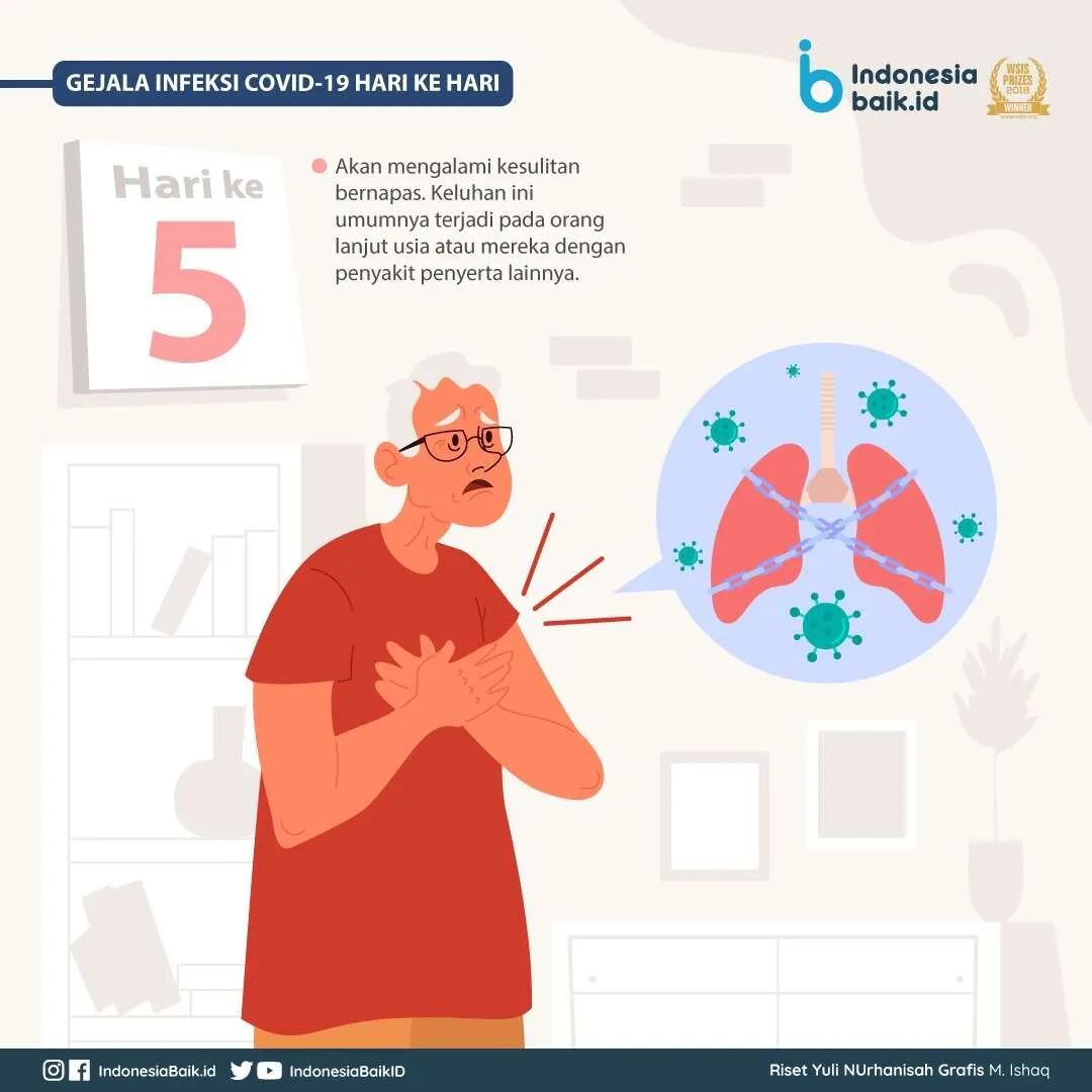 Hari ke-5, Pasien mungkin akan mengalami kesulitan bernapas. Keluhan ini umumnya terjadi pada orang lanjut lansia atau mereka dengan penyakit penyerta lainnya. Hari ke-7, Pada hari ke-7 umumnya pasien mulai melaporkan penyakitnya dan menjalani perawatan di rumah sakit.