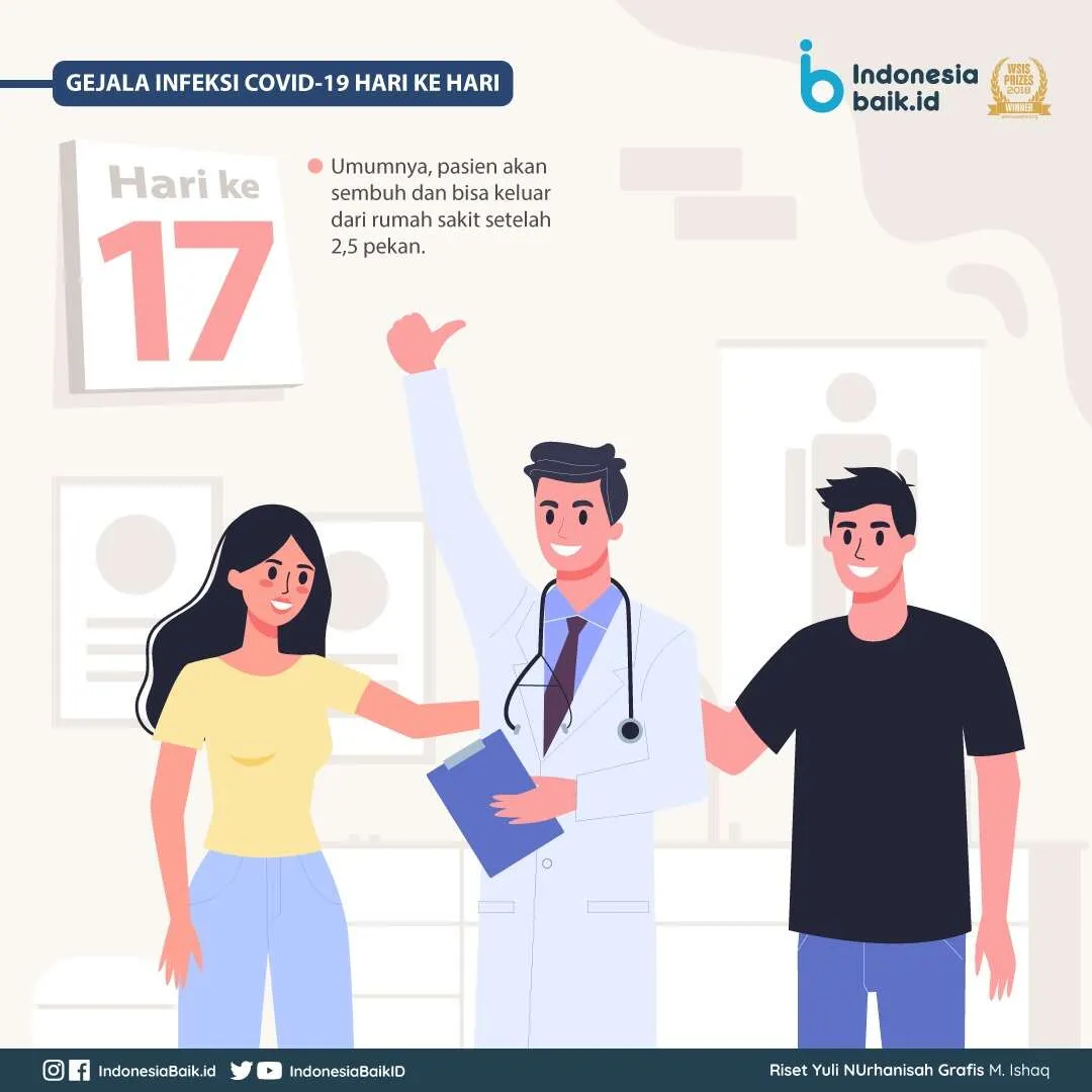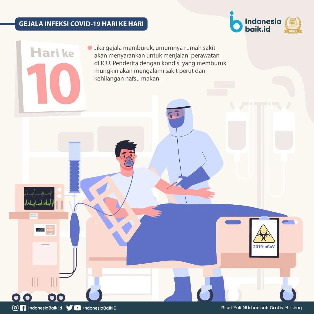 Hari ke-10, Jika gejala pasien memburuk, umumnya rumah sakit akan menyarankan untuk menjalani perawatan di ICU. Pasien dengan kondisi yang memburuk mungkin akan mengalami sakit perut dan kehilangan nafsu makan Hari ke-17, Umumnya, pasien akan sembuh dan bisa keluar dari rumah sakit setelah 2,5 pekan.