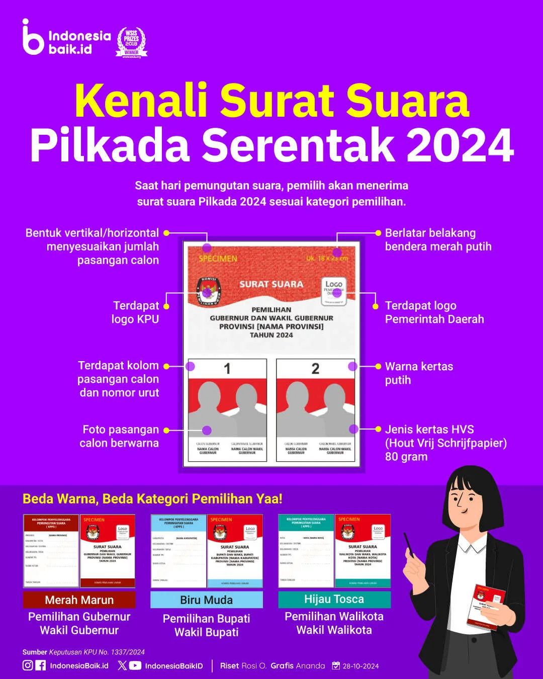 Indonesiabaik.id — Saat hari pemungutan suara, pemilih akan menerima surat suara Pilkada 2024 sesuai kategori pemilihan.