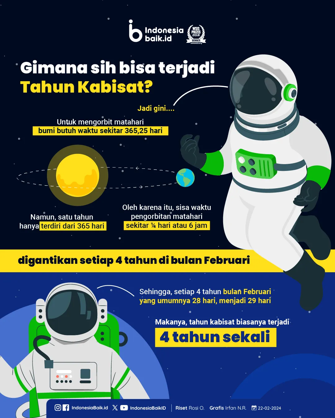 Umumnya, satu tahun terdiri dari 365 hari. Perhitungan itu didasarkan pada peristiwa bumi mengorbit matahari. Bumi butuh waktu sekitar 365,25 hari untuk mengorbit matahari. Namun, satu tahun hanya terdiri dari 365 hari. Oleh karena itu, sisa waktu pengorbitan matahari digantikan setiap 4 tahun di bulan Februari. Sehingga, setiap 4 tahun, bulan Februari berjumlah 29 hari, bukan 28 hari pada umumnya. Makanya, tahun kabisat terjadi 4 tahun sekali.