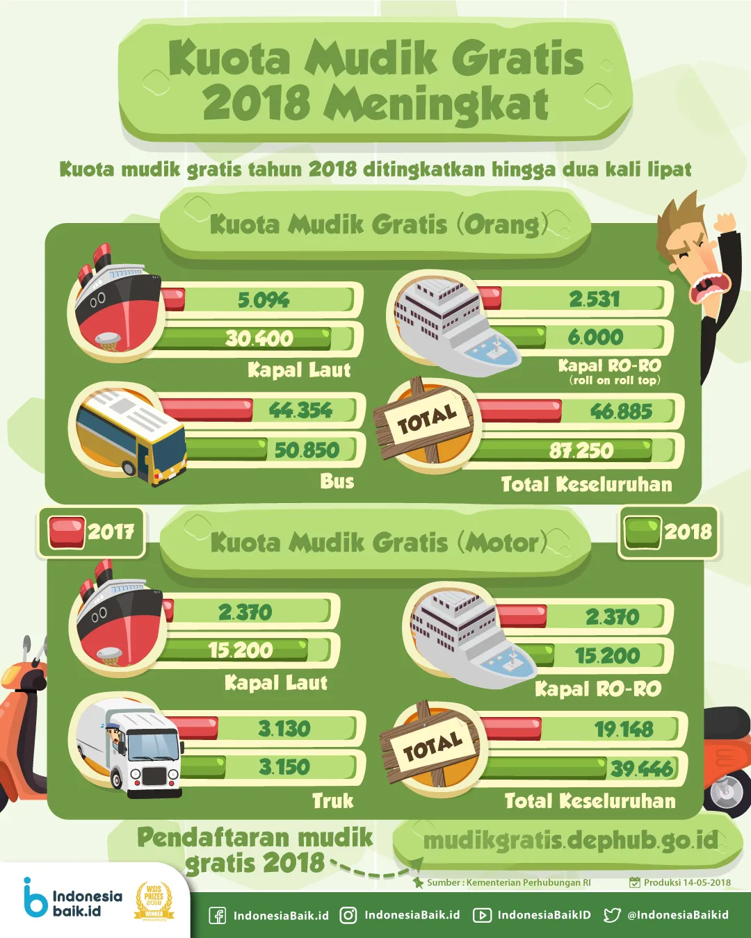 Indonesiabaik.id - Pemerintah meningkatkan hingga dua kali lipat kuota mudik gratis 2018. Total mudik gratis tahun ini yang disediakan untuk sepeda motor sebanyak 39.446, naik 106% dari tahun sebelumnya sebanyak 19.148. Sedangkan mudik gratis untuk orang sebanyak 87.250, naik 86% dari tahun sebelumnya yaitu 46.885. untuk program mudik gratis 2018, Kementerian Perhubungan menganggarkan sekitar 90 milyar rupiah dengan rincian 36 milyar rupiah untuk angkutan darat, 34 milyar rupiah untuk angkutan laut dan 20 milyar rupiah untuk angkutan kereta api.
