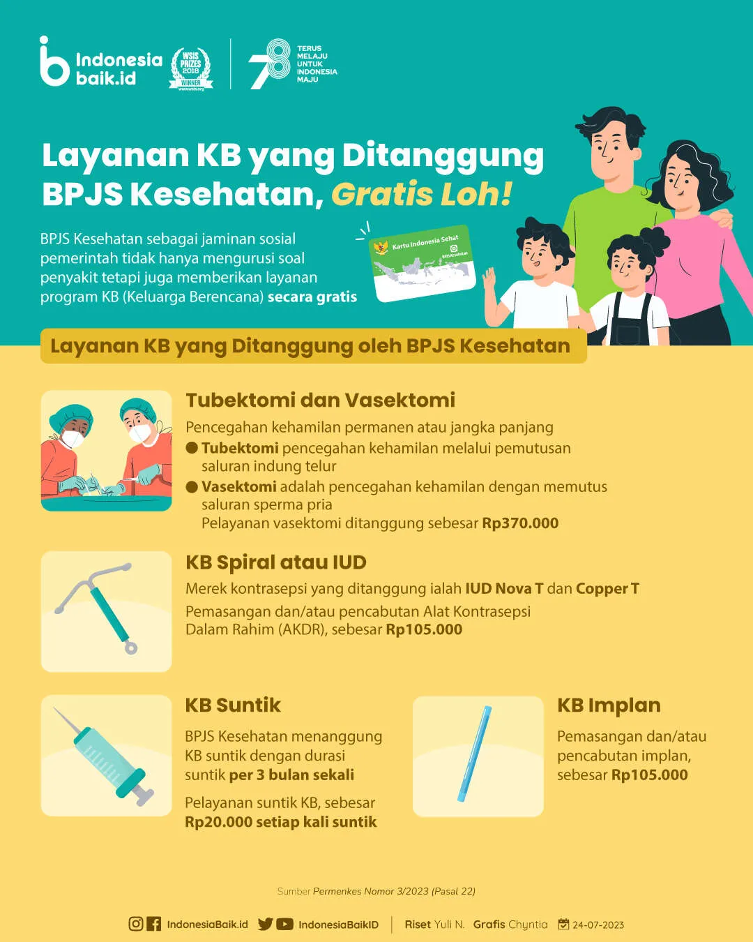 Nah, untuk mendukung program KB ini, BPJS Kesehatan sebagai jaminan sosial pemerintah dalam hal layanan kesehatan tak hanya mengurusi soal penyakit, imunitas, dan skrining kesehatan, tetapi juga memberikan layanan program KB (Keluarga Berencana) secara gratis.