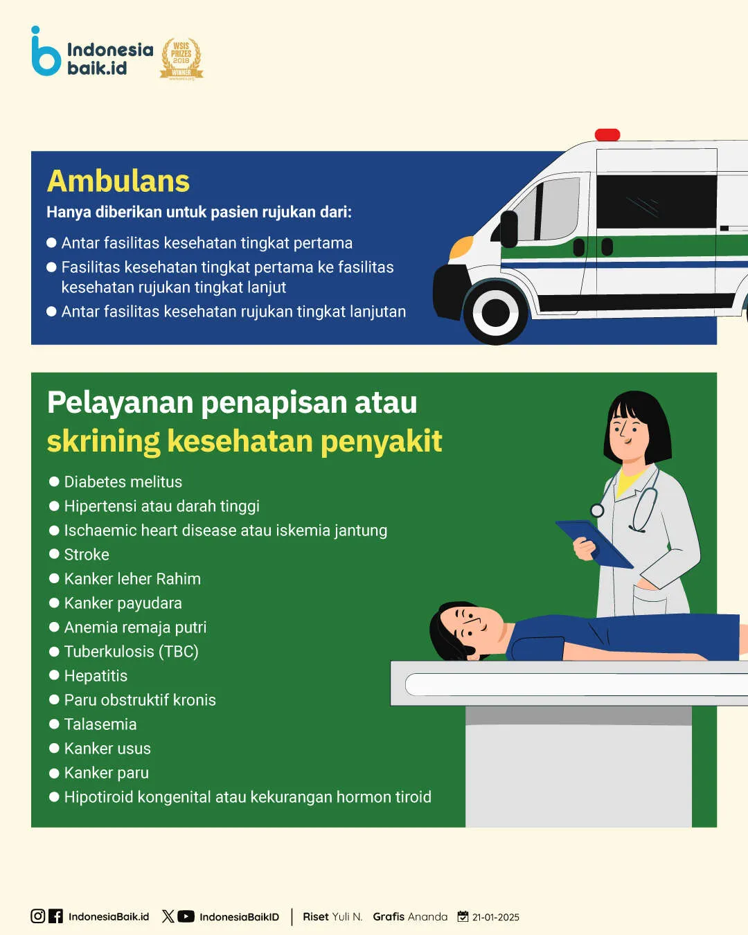 Fasilitas ambulans menjadi tanggungan BPJS Kesehatan dan hanya diberikan untuk pasien rujukan dari fasilitas kesehatan satu ke fasilitas kesehatan lainnya yang bertujuan menyelamatkan nyawa pasien.
