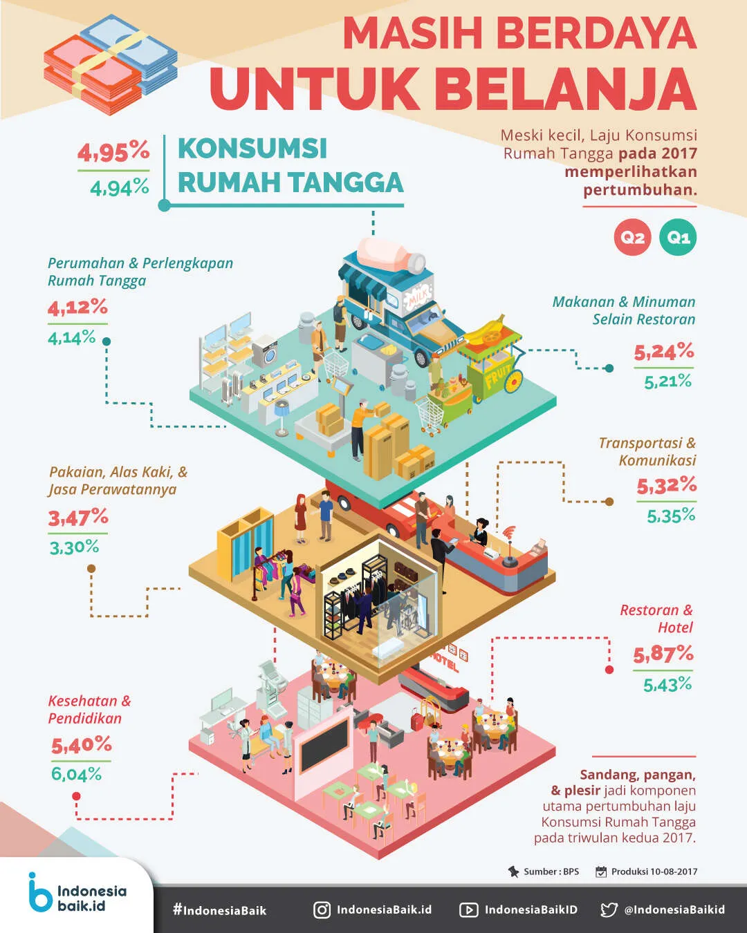 Dari data tersebut terlihat terjadi pergeseran pola konsumsi masyarakat Indonesia pada kuartal II 2017. Khususnya karena peningkatan konsumsi hotel dan restoran yang cukup signifikan sebesar 0,34% dibanding kuartal sebelumnya.