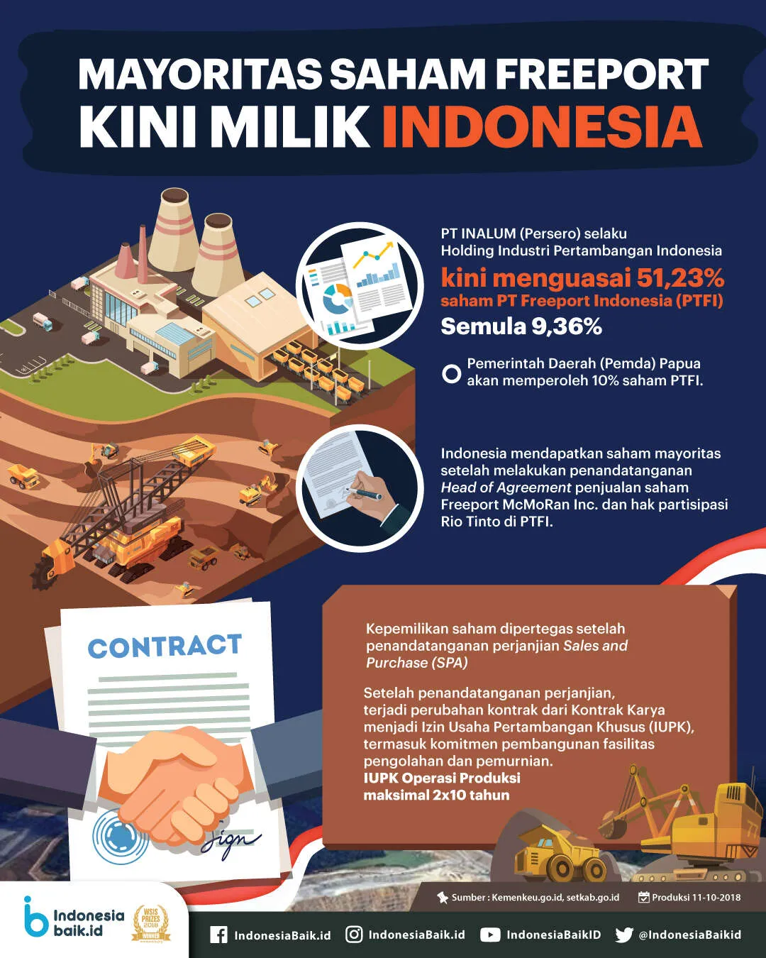 Indonesiabaik.id - Setelah sekian lama terjadi proses negosiasi yang alot antara Freeport dengan Pemerintah Indonesia. Pada tanggal 12 Juli, PT Indonesia Asahan Aluminium (INALUM) selaku Holding Industri Pertambangan Indonesia bersama Freeport McMoRan Inc. (FCX) dan Rio Tinto, sepakat melakukan penandatanganan Pokok-Pokok Perjanjian (Head of Agreement) terkait penjualan saham FCX dan hak partisipasi Rio Tinto di PT Freeport Indonesia (PTFI) ke INALUM.