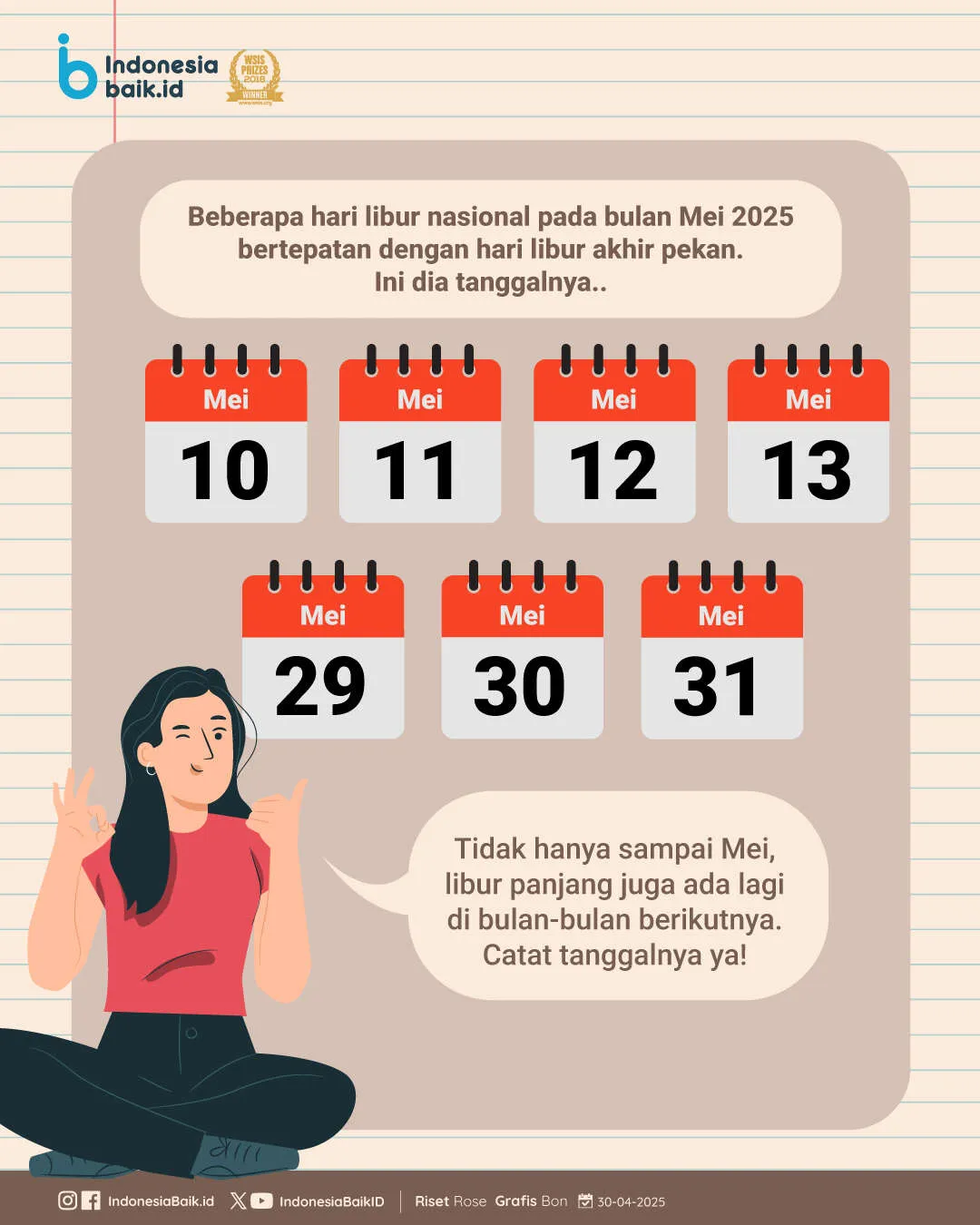 Selama bulan Mei 2025, beberapa hari libur nasional bertepatan sama hari libur akhir pekan, nih SohIB. Yang artinya, ada libur panjang!